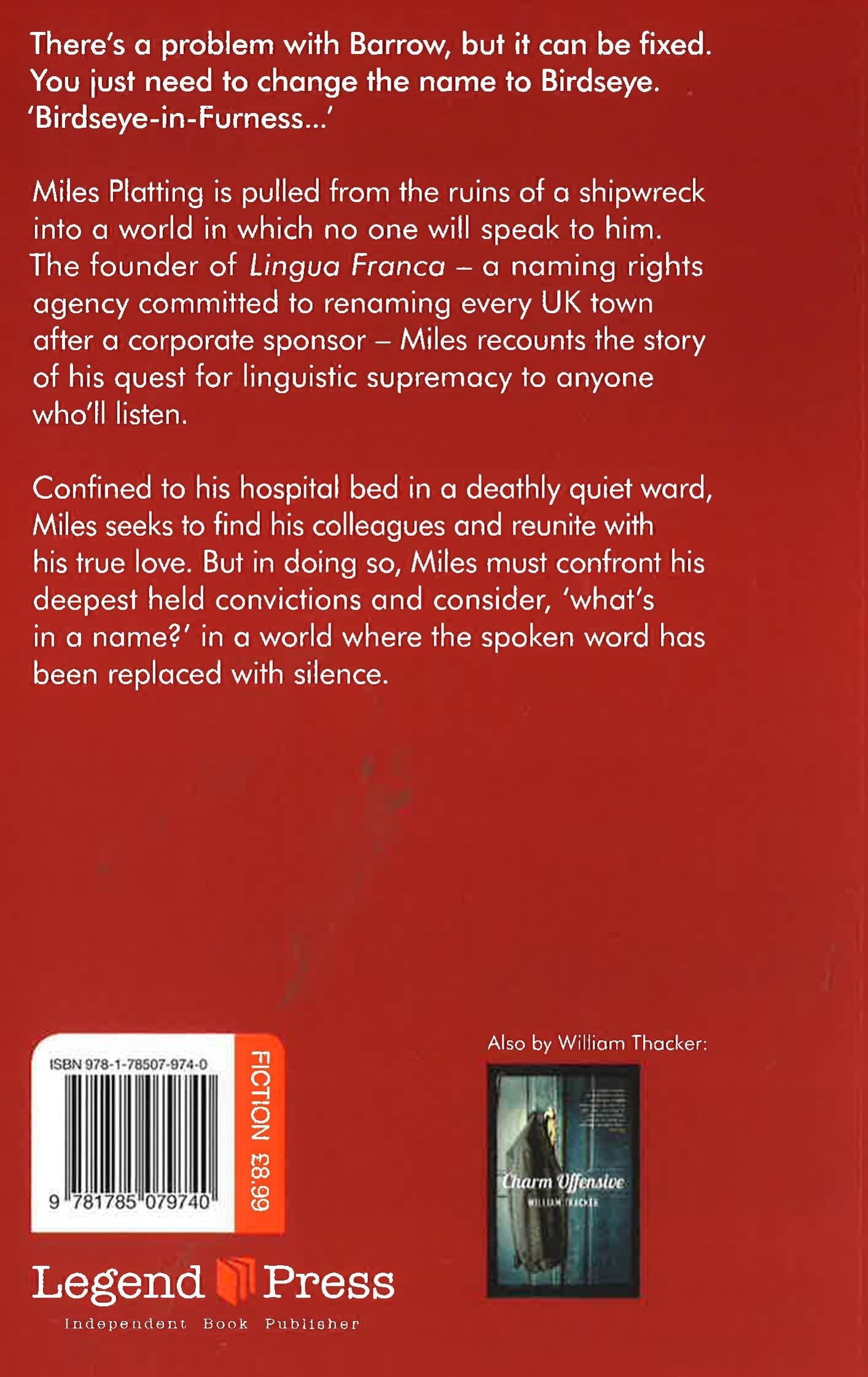 The founder of Lingua Franca - a naming rights agency committed to renaming every UK town after a corporate sponsor - Miles recounts the story of his quest for linguistic supremacy to anyone who'll listen. Confined to his hospital bed in a deathly quiet ward, Miles seeks to find his colleagues and reunite with his true love.
