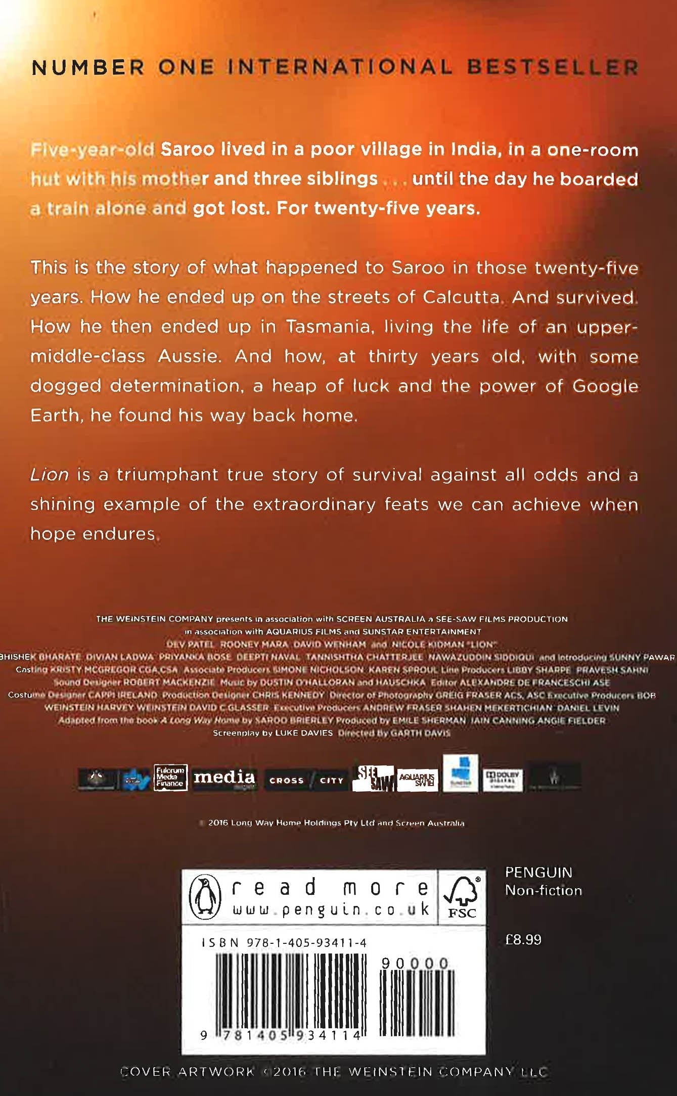 NOMINATED FOR SIX OSCARS, INCLUDING BEST PICTURE, SUPPORTING ACTOR AND SUPPORTING ACTRESS . . . Aged just five, Saroo Brierley lost all contact with his family in India, after waiting at a train station for his brother who never returned. Discover the inspiring, true story behind the film, Lion. This is the heart breaking and original tale of the lost little boy who found his way home twenty-five years later. As a five-year old in India, I got lost on a train. Twenty-five years later, I crossed the world to find my way back home. Five-year-old Saroo lived in a poor village in India, in a one-room hut with his mother and three siblings... until the day he boarded a train alone and got lost. For twenty-five years. This is the story of what happened to Saroo in those twenty-five years. How he ended up on the streets of Calcutta. And survived. How he then ended up in Tasmania, living the life of an upper-middle-class Aussie. And how, at thirty years old, with some dogged determination, a heap of good luck and the power of Google Earth, he found his way back home. Lion is a triumphant true story of survival against all odds and a shining example of the extraordinary feats we can achieve when hope endures.