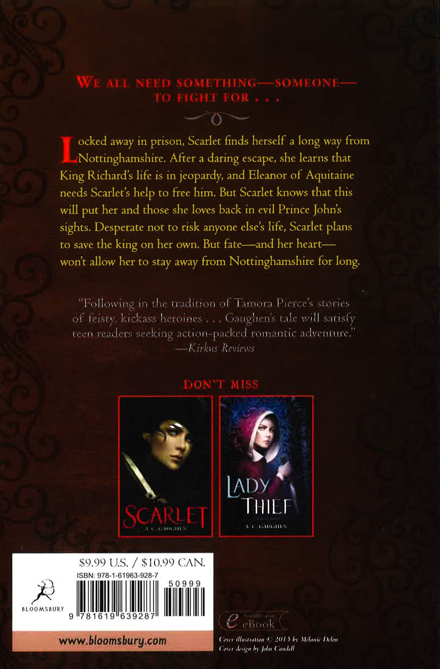 Scarlet has captured the hearts of readers as well as the heart of Robin Hood, and after ceaseless obstacles and countless threats, readers will finally find out the fate of the Lady Thief. Imprisoned by Prince John for months, Scarlet finds herself a long way from Nottinghamshire. After a daring escape from the Prince's clutches, she learns that King Richard's life is in jeopardy, and Eleanor of Aquitaine demands a service Scarlet can't refuse: spy for her and help bring Richard home safe. But fate--and her heart--won't allow her to stay away from Nottinghamshire for long, and together, Scarlet and Rob must stop Prince John from going through with his dark plans for England. They can not rest until he's stopped, but will their love be enough to save them once and for all?