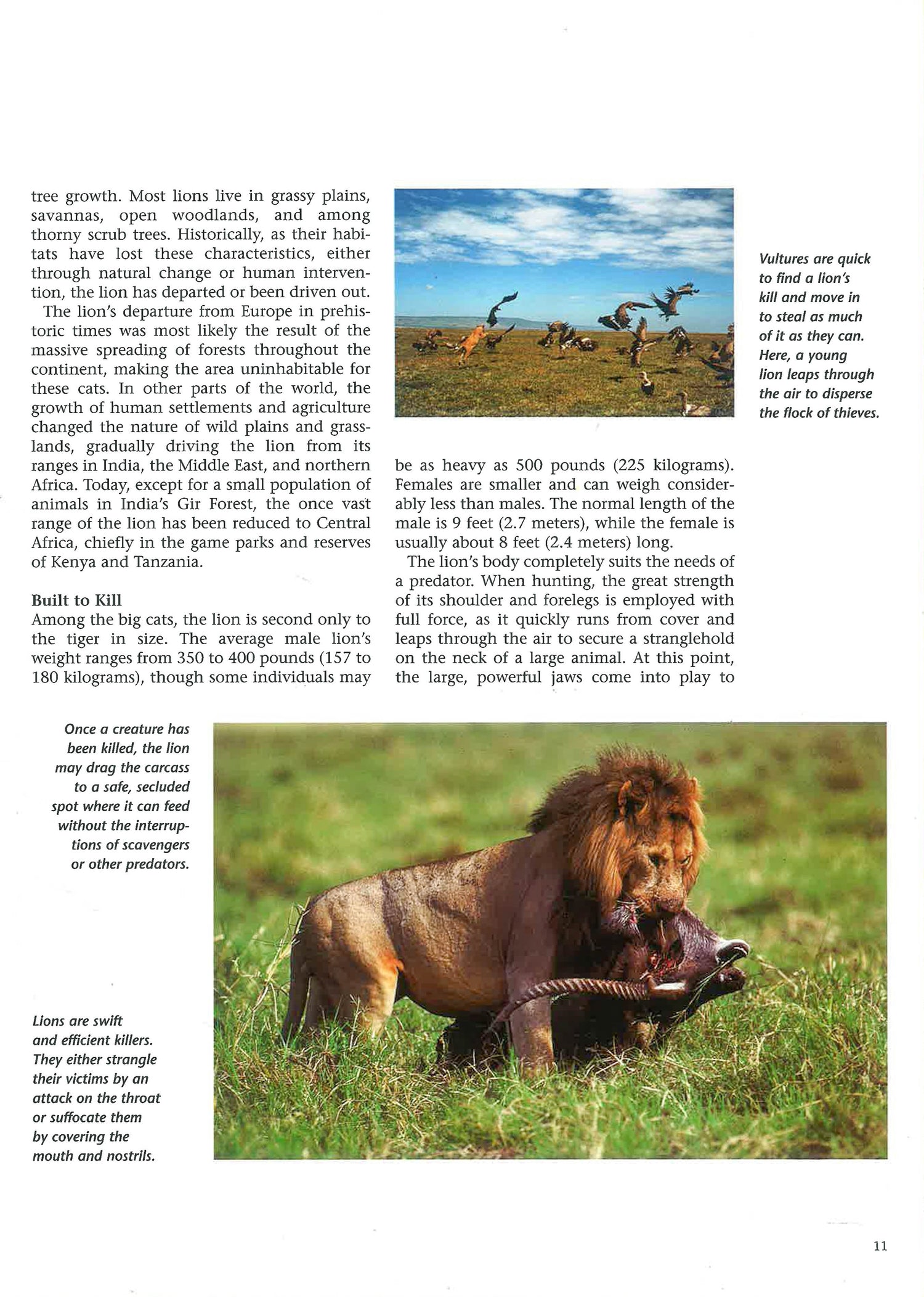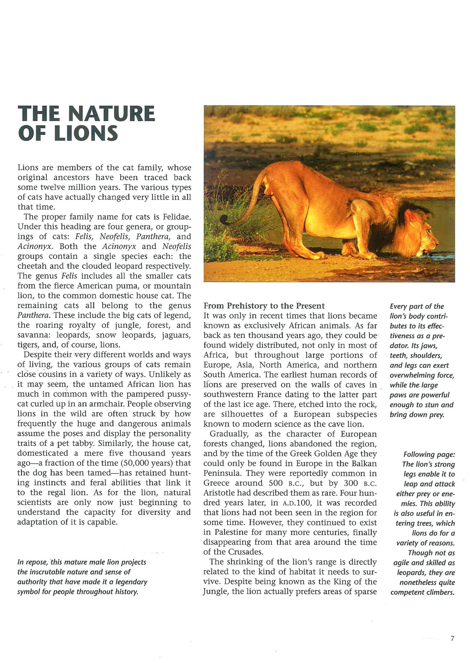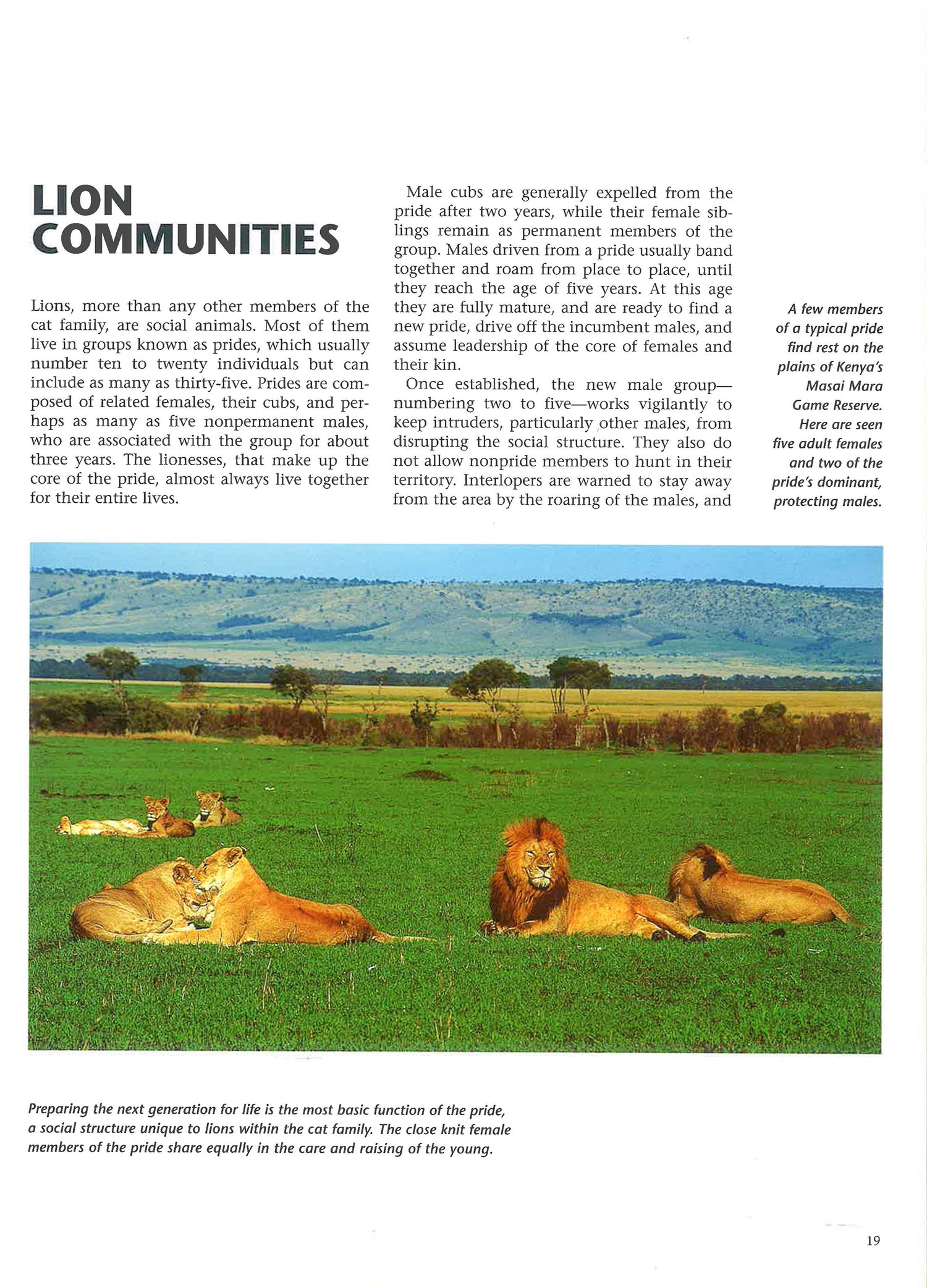 Over 80 illustrations. Of all animals, the lion is one of the most intriguing. Venerated as a symbol of strength for thousands of years, its place in nature as a fierce and powerful predator is no less striking. Here is the story of the only social animals in the cat family, known for their preference for living in close family groups called "prides." Held together by bonds of mutual trust, pride members become killing teams that completely cooperate in the tracking, stalking, and taking of prey. From the great game reserves of Kenya to the more remote corners of Uganda, this volume provides an action-packed look at the hunting techniques, mating rituals, and complex life of the King of Beasts, vividly illustrated with 80 full-color photographs.