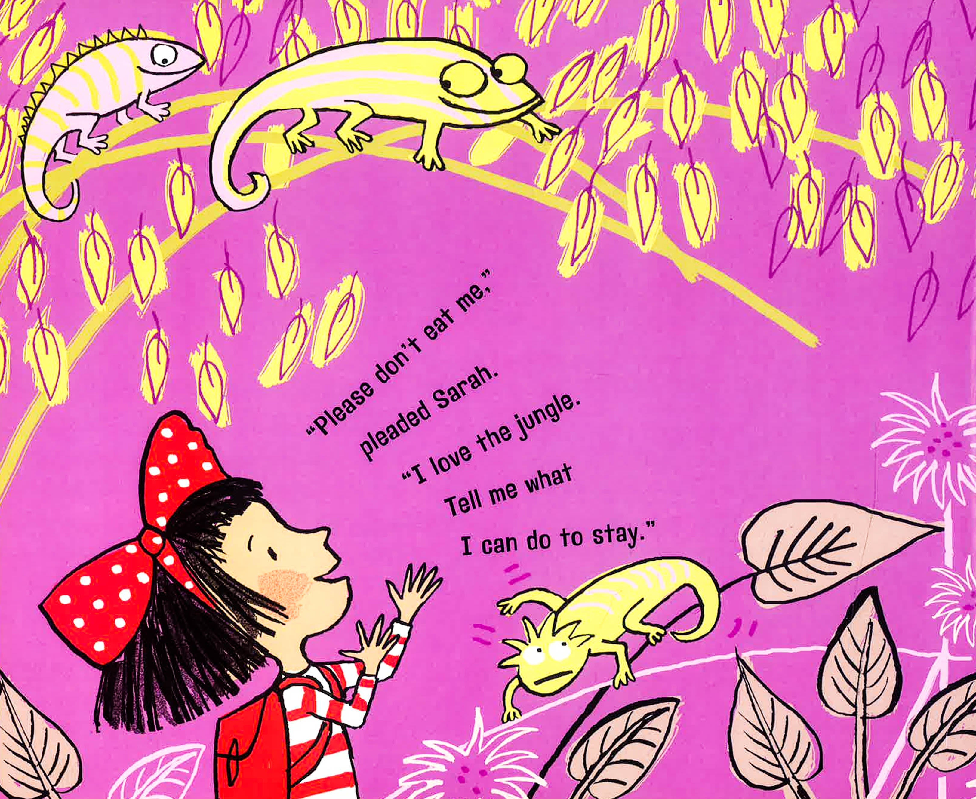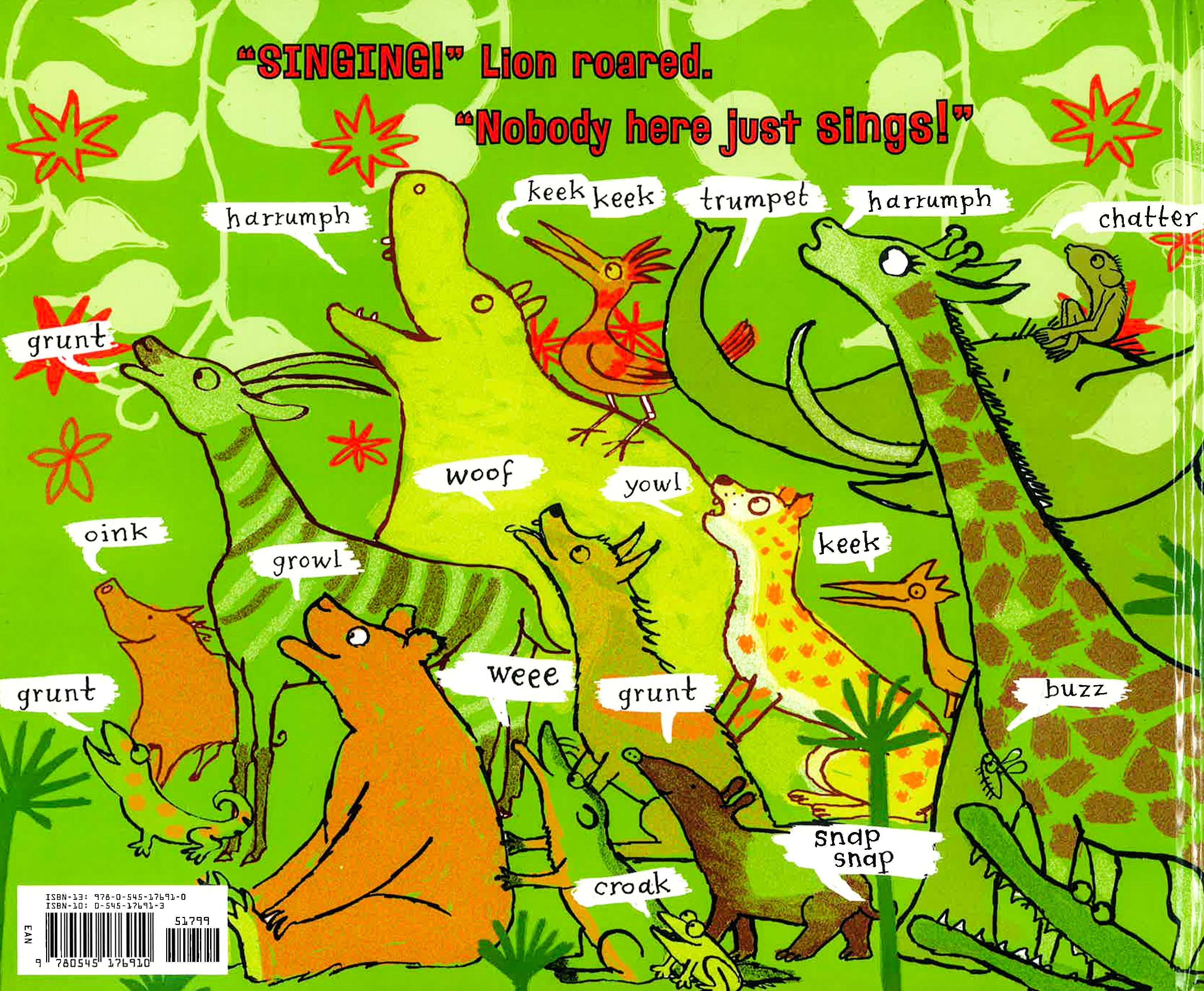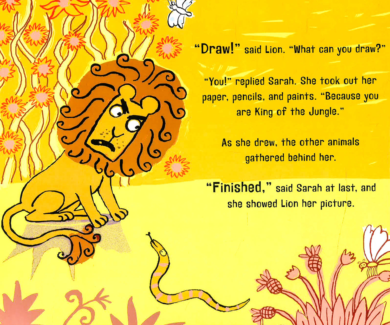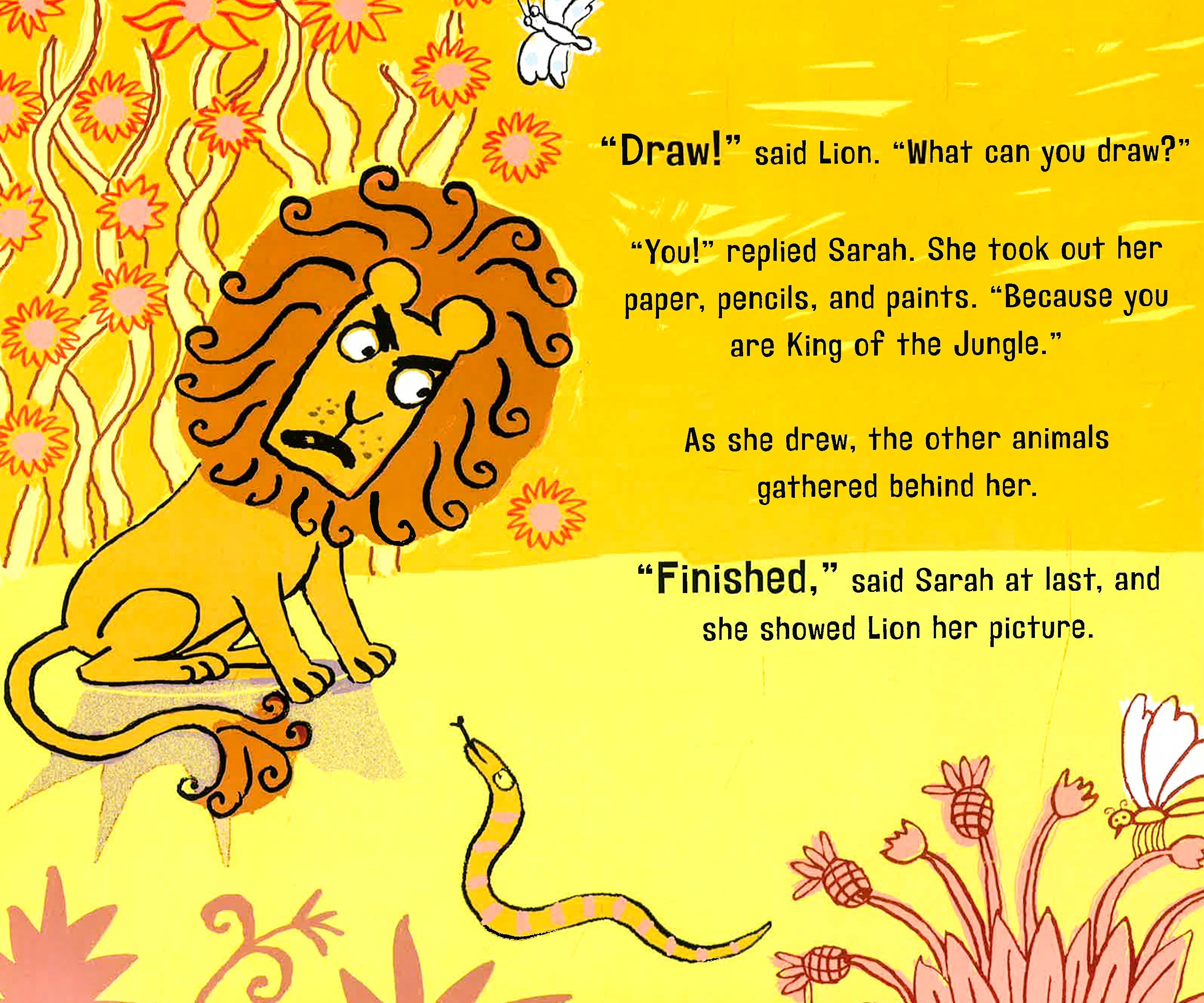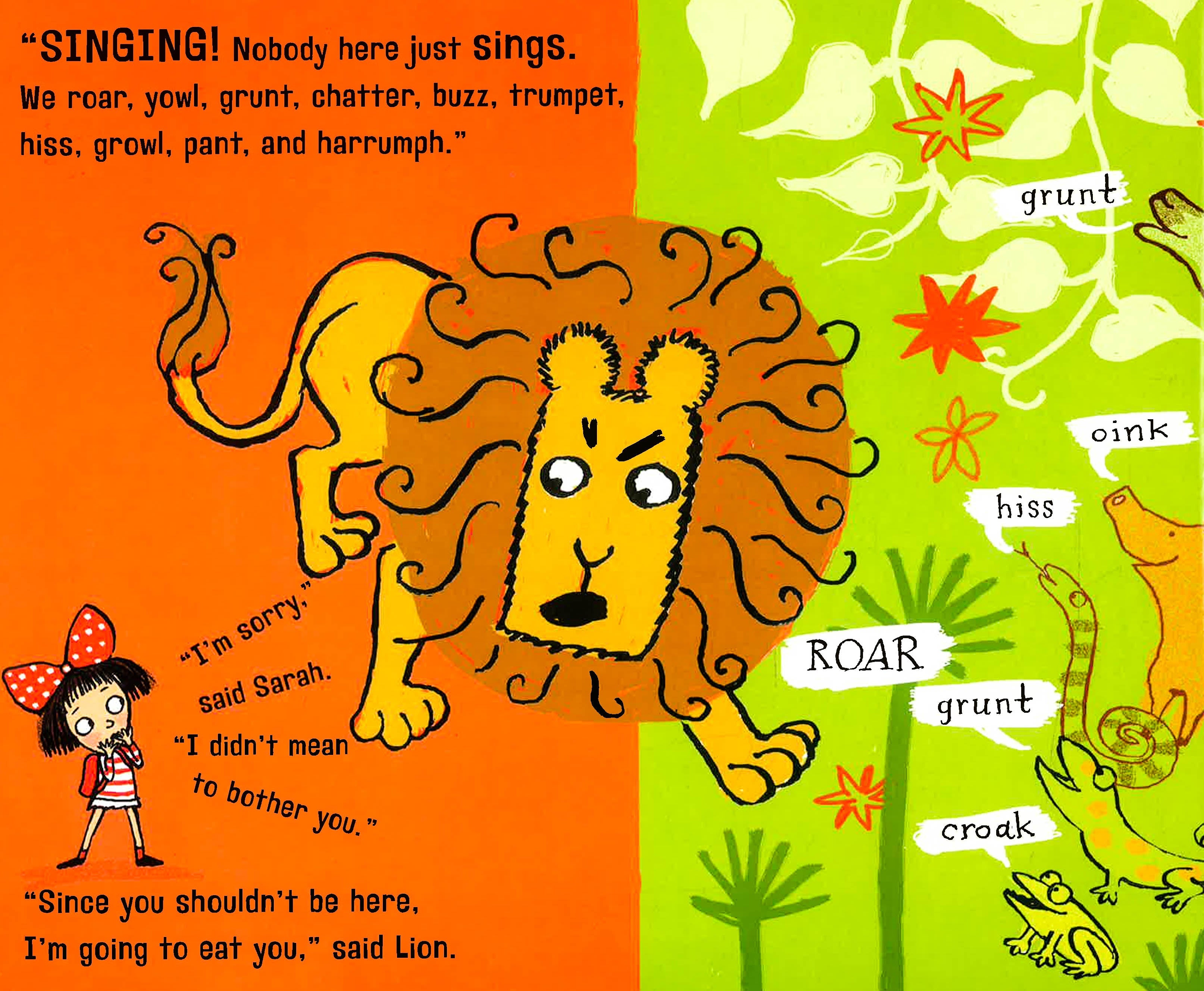 Sarah is strolling through the jungle, singing a happy song, when Lion pounces. How dare she trespass on his turf? He is King of the Jungle where nobody strolls and sings: They lumber and grunt, sprint and squeak, slither and harrumph! Lion makes an executive decision to eat the little girl for lunch. But Sarah thinks fast: True, she can't wallow like the hippo or wriggle like the snake, but she can draw. She paints a portrait of Lion. "I don't look that grumpy!" he protests. "Yes, you do!" all the animals chorus. Soon Sarah is the jungle's artist-in-residence!