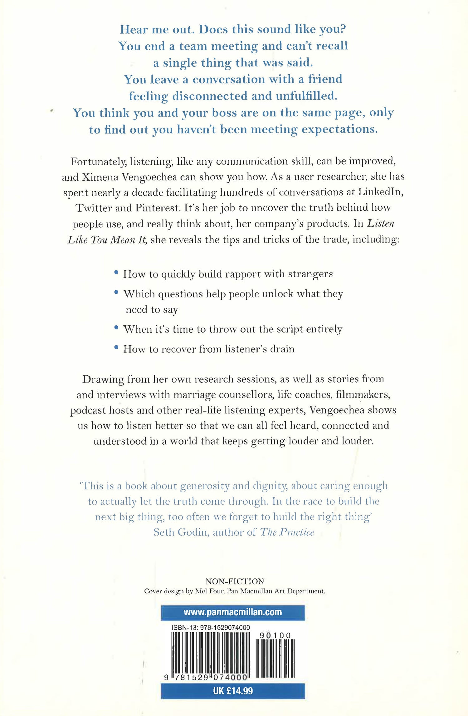 ‘Could there be a more relevant book for our times? While there are plenty of books on persuasion, none tells us how to influence others through the quiet art of understanding. Vengoechea implores us to truly hear other people (maybe for the first time) and is the perfect author of a book on why we should listen like we mean it’ Nir Eyal, bestselling author of Hooked and Indistractable