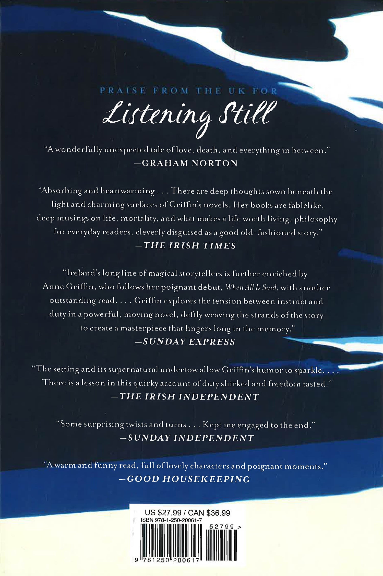 So when Jeanie's parents unexpectedly announce their plan to retire, she is jolted out of her limbo. In this captivating successor to her much-lauded debut, When All Is Said, Anne Griffin portrays a young woman who is torn between duty, a comfortable marriage, a calling she both loves and hates and her last chance to break free. Listening Still is a heartachingly honest look at what we give up and what we gain when we choose to follow our heart.