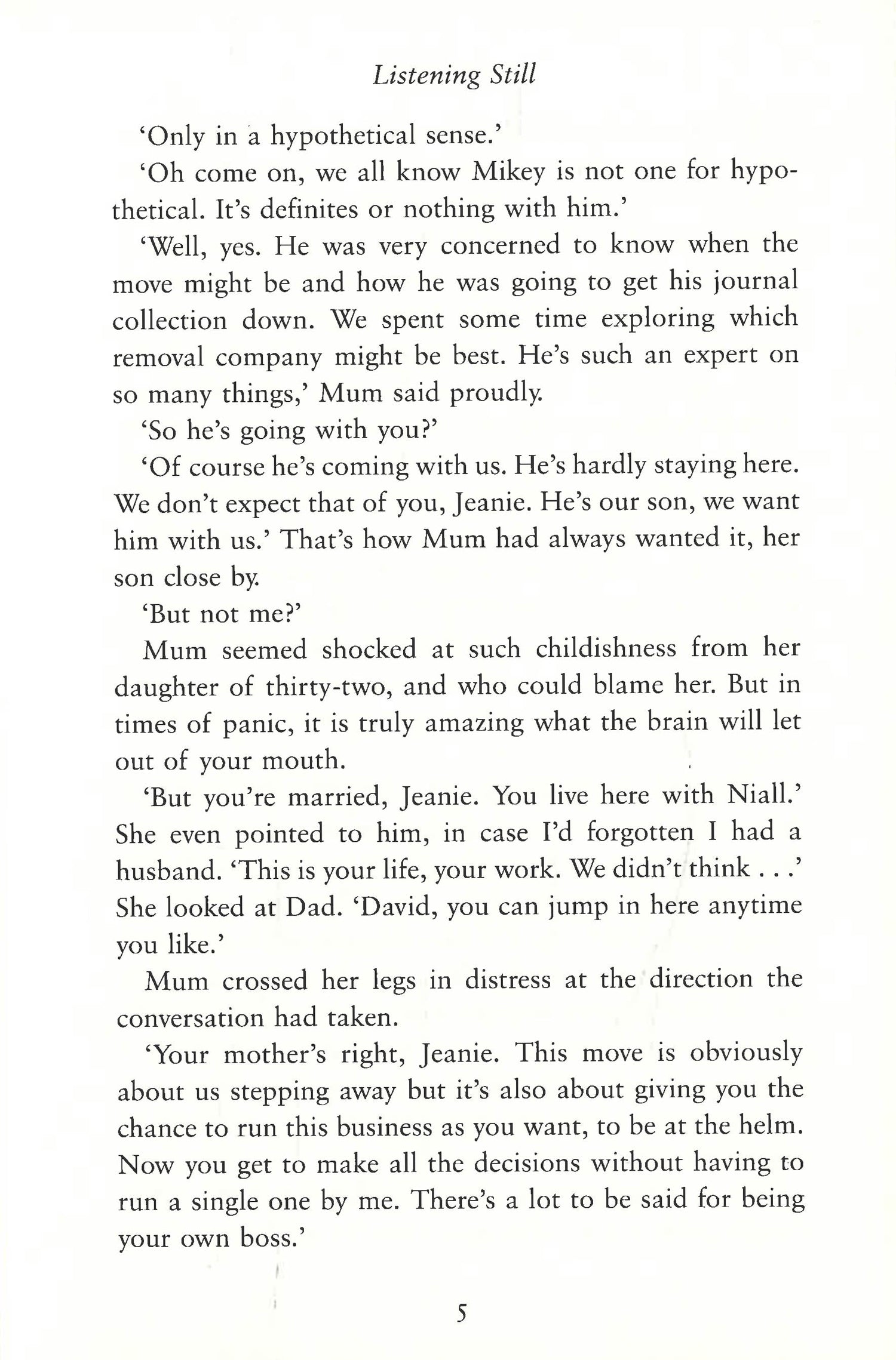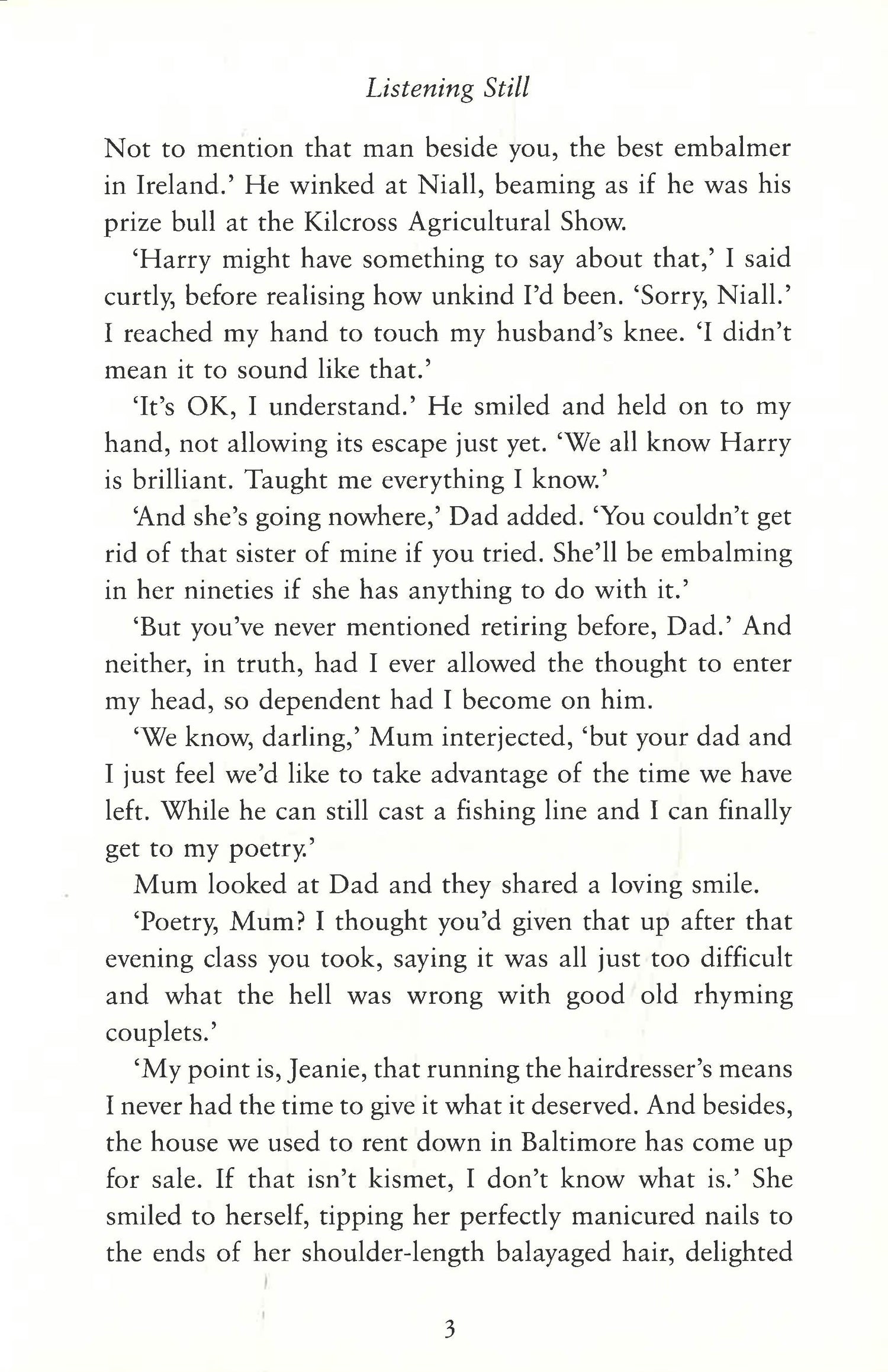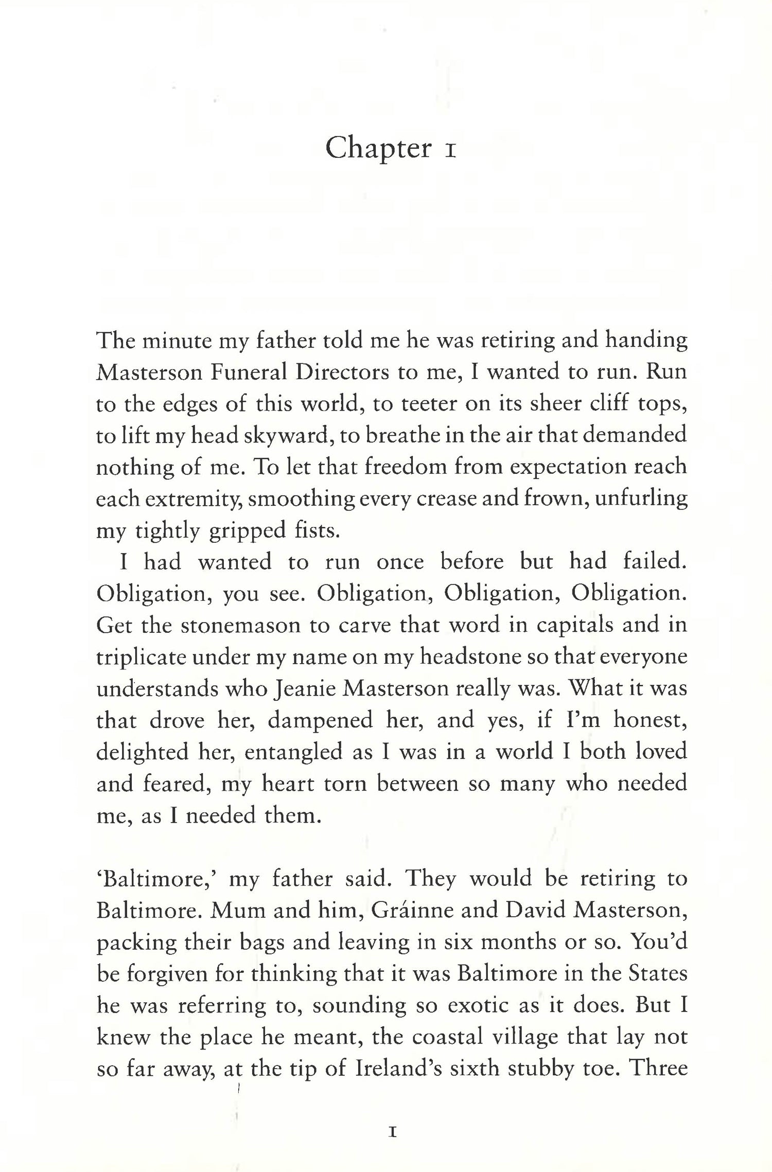 Jeanie Masterson has a gift: she can hear the recently dead and give voice to their final wishes and revelations. Inherited from her father, this gift has enabled the family undertakers to flourish in their small Irish town. Yet she has always been uneasy about censoring some of the dead's last messages to the living. Unsure, too, about the choice she made when she left school seventeen years ago: to stay or leave for a new life in London with her charismatic teenage sweetheart.