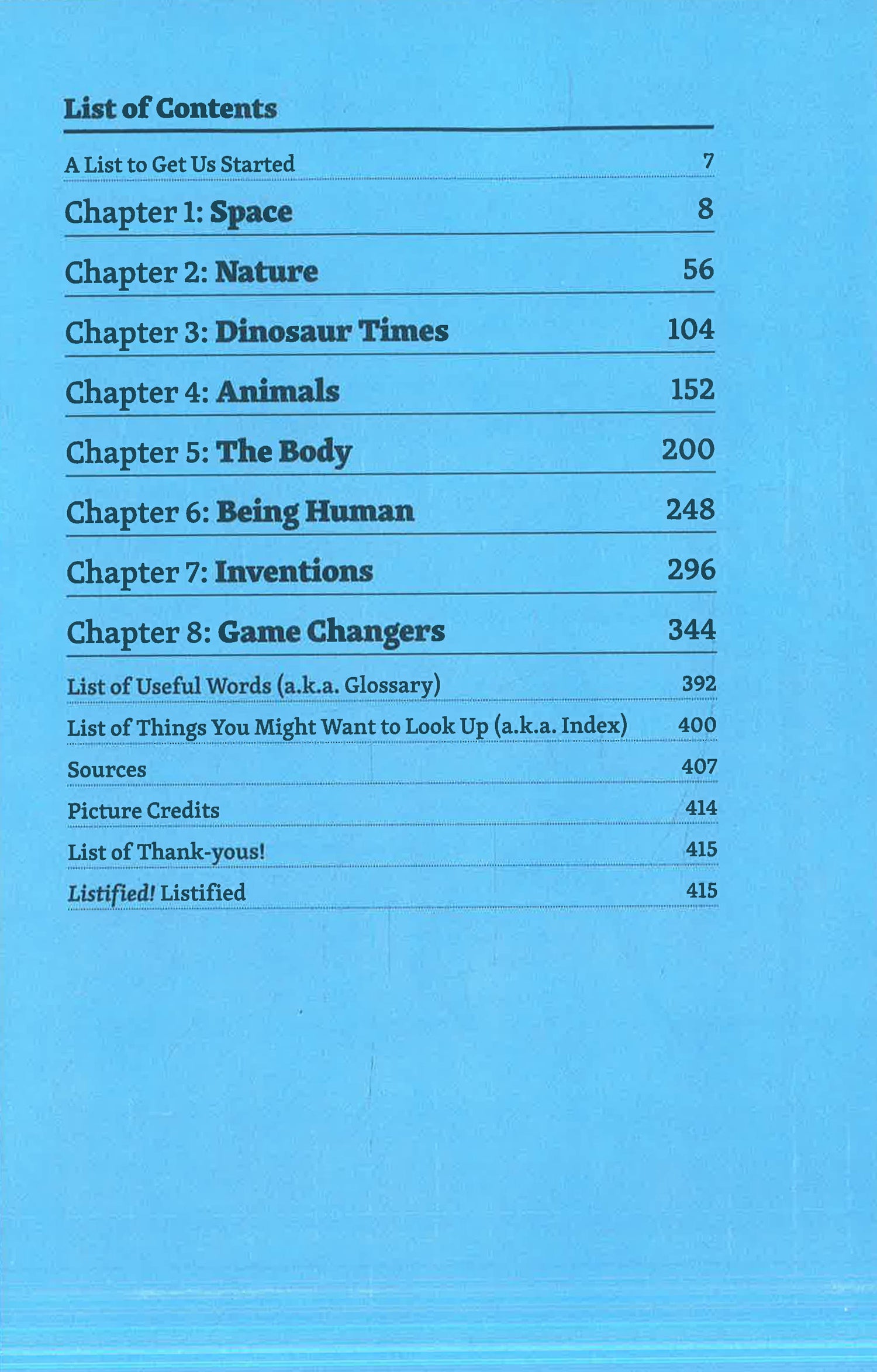 Ever wondered which 10 dinosaurs were the largest, and what they weighed...in cats? Or how much of your DNA you share with other animals...and bananas? Enter the listiverse and get ready to see the world in a whole new way. Listified! takes the best and most amazing parts of the universe --erupting volcanoes, medieval machines, jumping spiders, exploding stars, and everything in between -- and organizes them into quirky list form for curious kids and their friends and family to enjoy.