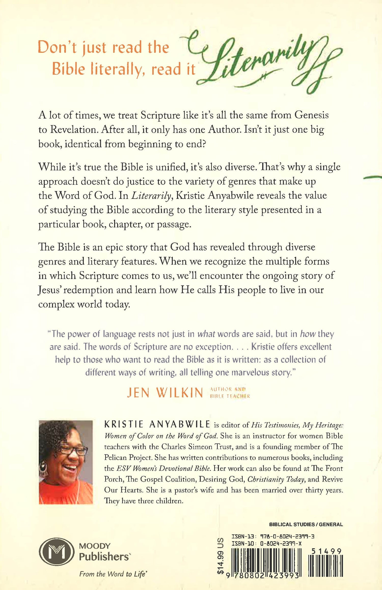 Long-time Bible teacher Kristie Anyabwile discovered as she prepared her lessons that a single inductive approach doesn't do justice to the variety of genres that make up the Word of God. Because Scripture is a collection of writings that spans 1,500 years, many literary styles are represented and each must be taken into account for the fullest understanding of God's Word. Kristie shows you the immense value of studying the Bible literarily--that is, according to the literary style presented in a particular book, chapter, or passage. In Literarily, Kristie will take you through these eight distinct genres: