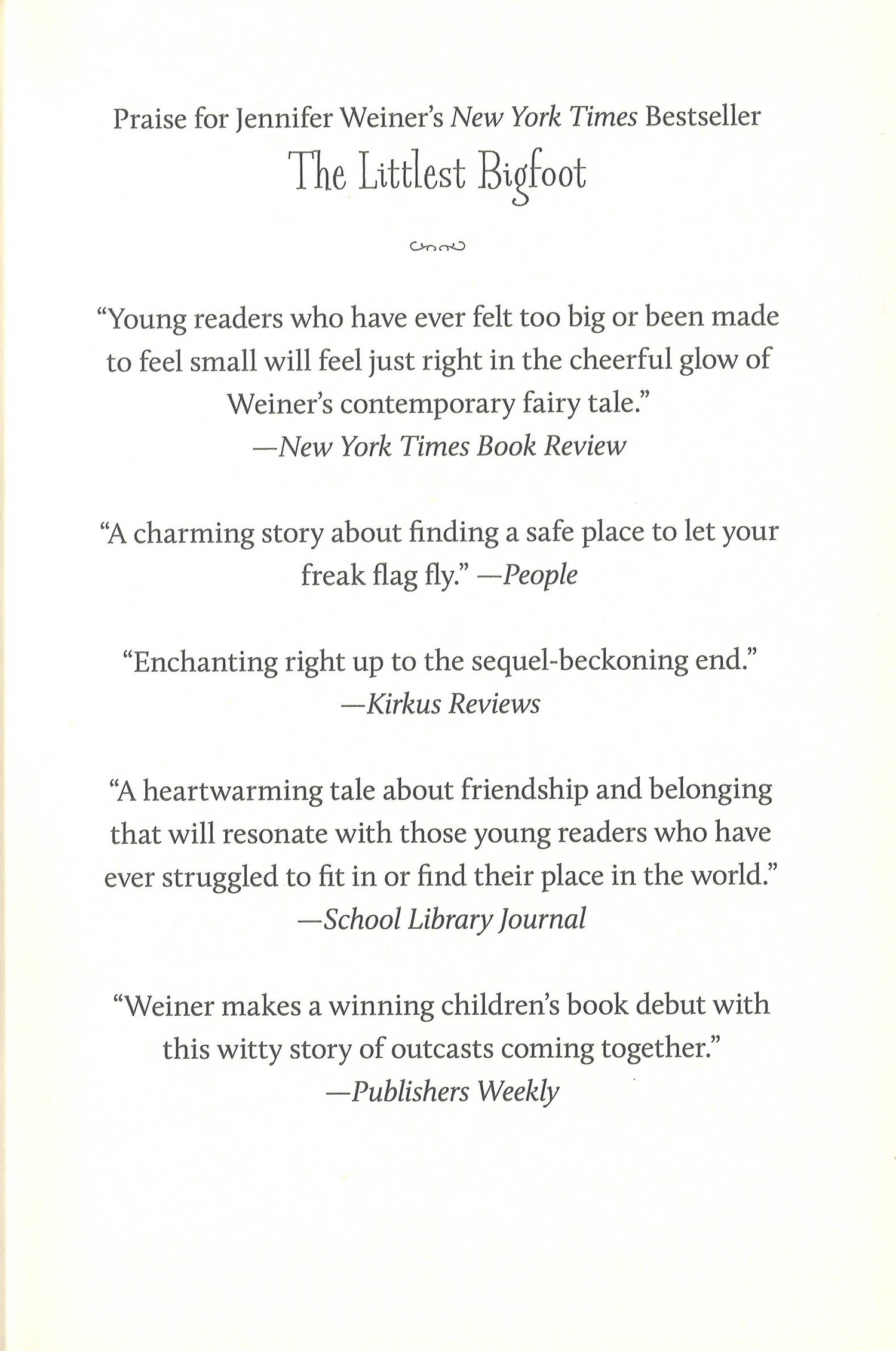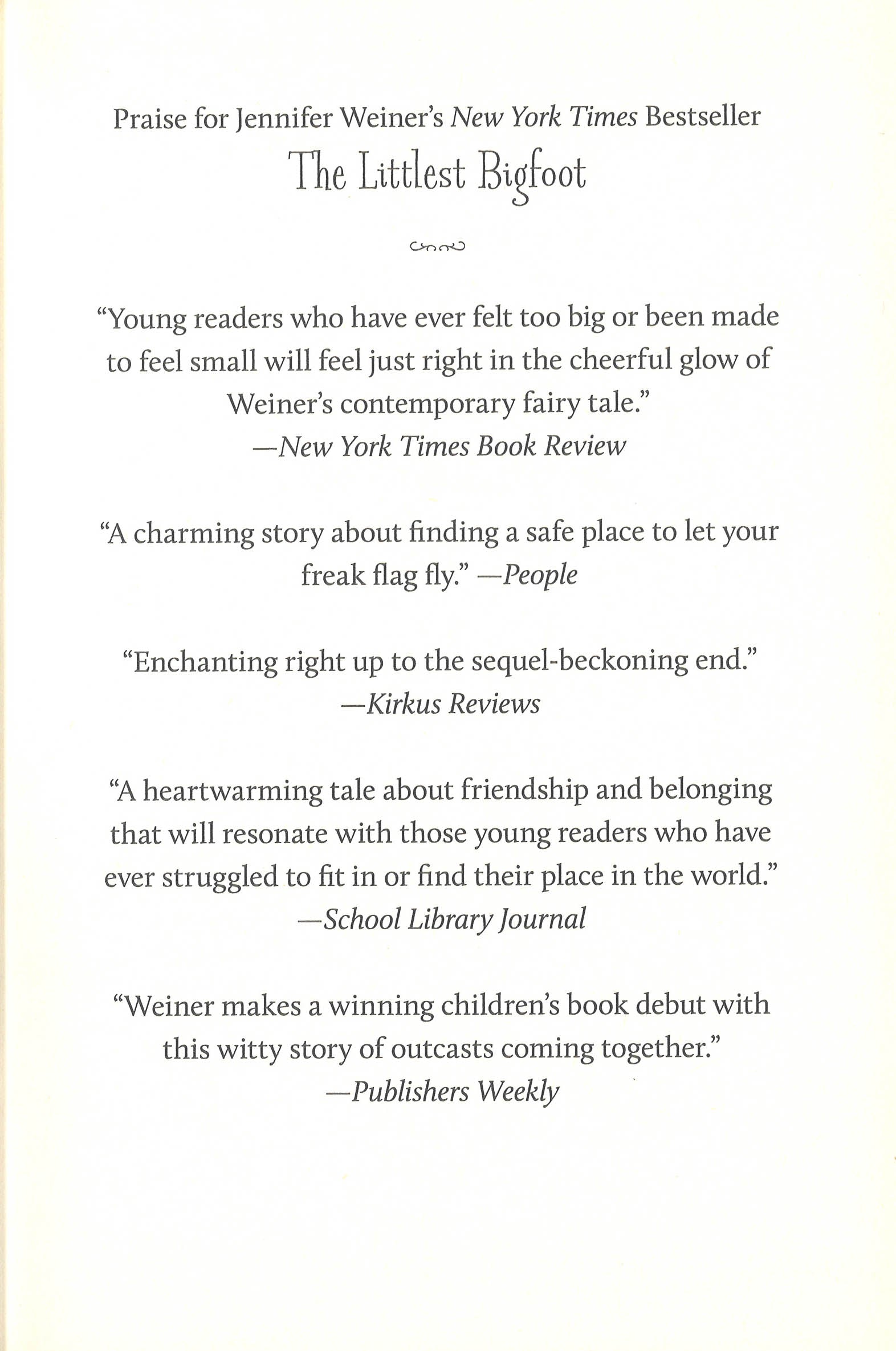 From #1 New York Times bestselling author Jennifer Weiner comes the second book in the "smartly crafted" (BCCB) and "heartwarming" (School Library Journal) trilogy about friendship, furry creatures, and finding the place where you belong. Twelve-year-old Alice Mayfair has a secret. She's not human. But who--or what--is she? While Alice goes in search of her past, her best friend Millie Maximus, a tiny Bigfoot with a big voice, prepares for her future. Together they plan to sneak off to New York City, where Millie hopes to audition for The Next Stage, the TV show she's sure will rocket her to stardom and free her from the suffocating expectations of her tribe. Meanwhile Jeremy Bigelow's Bigfoot research has put him on the radar of a shadowy government organization led by a mysterious man named Trip Carruthers. The Bigfoots have something, a chemical so powerful and dangerous that the government will do anything to obtain it. And Jeremy is tasked with securing it once and for all. In an unexpected twist of fate, Jeremy, Alice, and Millie find themselves facing off at a crossroads. But in order to determine where they're going, they have to first figure out where they come from--and draw the line between what is good, what is evil, and what it means to be a hero.