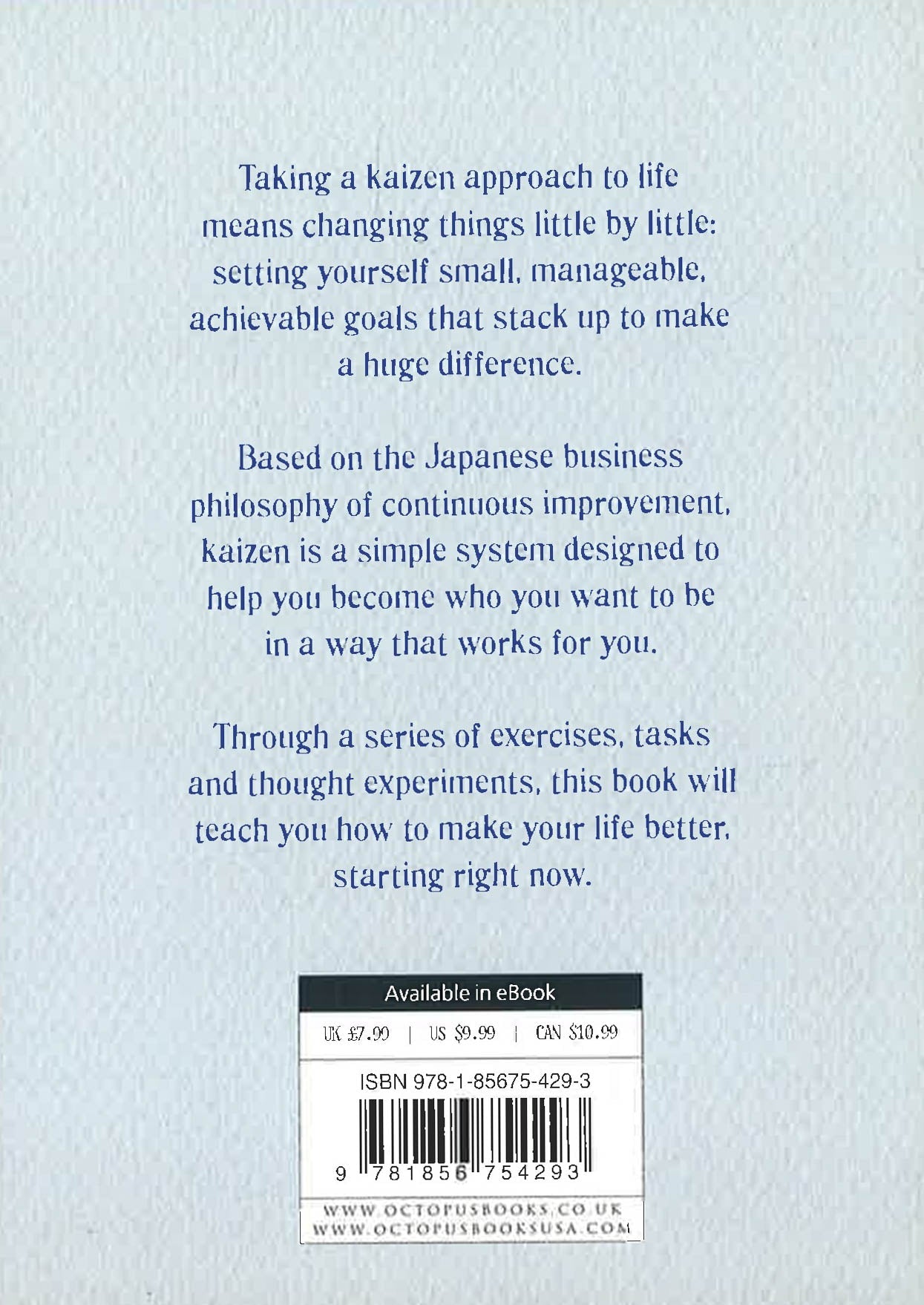 A beautifully designed introduction to the Japanese concept of 'Kaizen' - the art of self-improvement. Kaizen is a term that has long been used in the business world to emphasise constant development and transformation. But Kaizen has the power to transform all areas of life. Learn how even the smallest steps can help us to form new habits, build confidence and break down our in-built resistance to life's challenges. Rooted in 2,000 year old wisdom, Kaizen reinforces the benefits positive change, one step at a time. With over 70 simple prompts and exercises to help you improve your health, relationships and wellbeing or save money and excel at work, everything you need to know to utilise Kaizen every day is here.