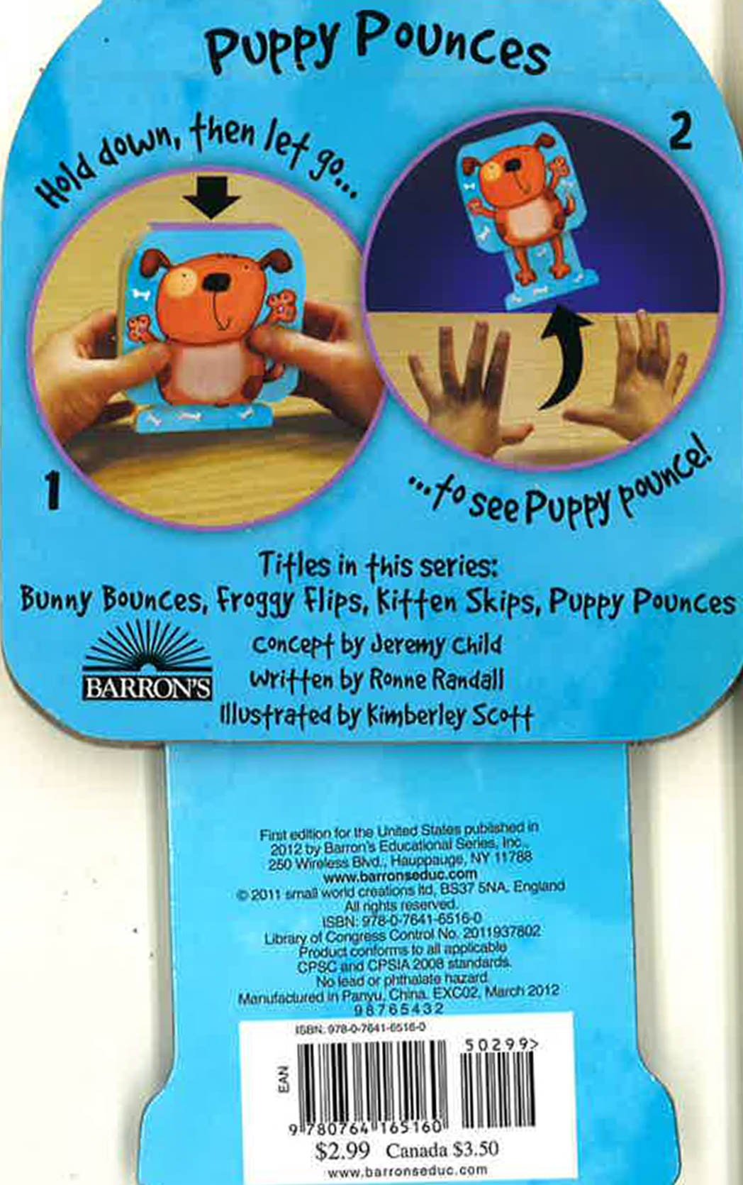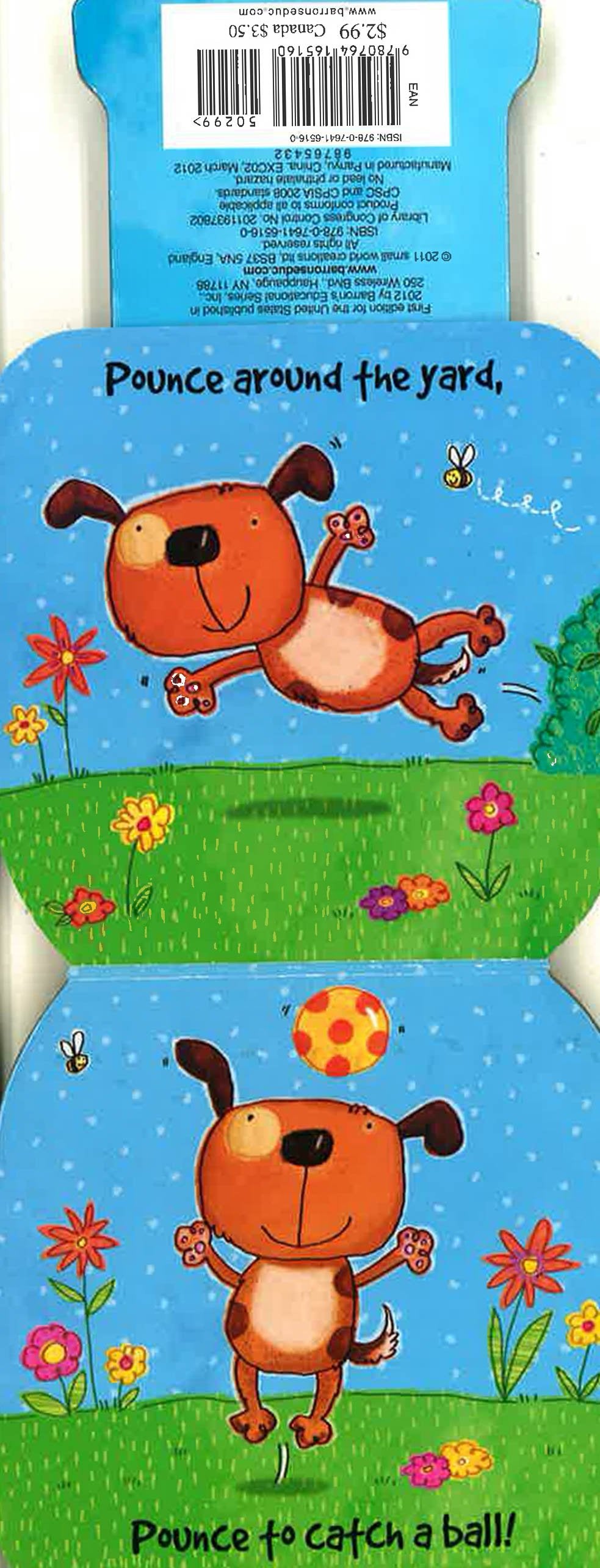 This miniature board book literally bounces! Each "Little Bouncer " book in this series comes with an illustrated pair of hind legs printed on a heavy cardboard attachment that extends from the book's bottom surface, directly beneath the animal who's pictured on the front cover. The pair of legs is attached to the book with an internal spring. Kids can stand the book on its feet, then press down and let go--and the entire book hops into the air! When kids open these books they'll find comical pictures on every board page and brief, slightly silly stories about animals who love to hop, jump, and bounce.