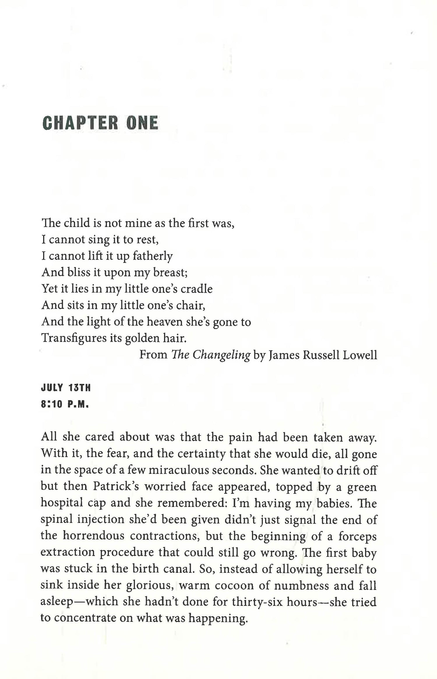 A month passes and one bright summer morning, the babies disappear from Lauren's side in a park. When they're found, something is different about them. The infants look like Morgan and Riley--to everyone else. But to Lauren, something is off. As everyone around her celebrates their return, Lauren begins to scream, These are not my babies.