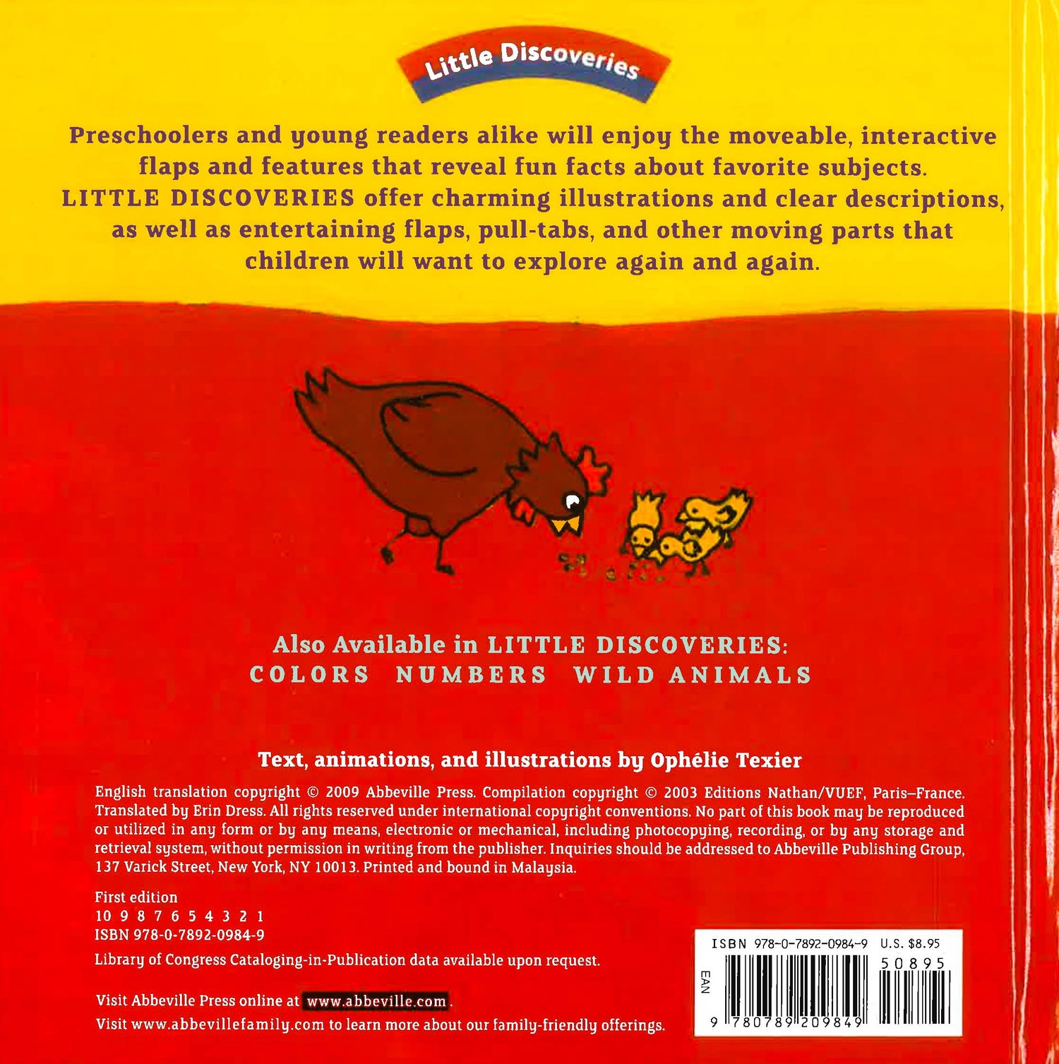 Little Discoveries is a series of four books with fun flaps and moveable, pop-up features that engage children with an interactive, hands-on learning experience. Little Discoveries is an interactive pop-up, pull-out children's board book series. The first four of these moveable, three-dimensional books are entitled Baby Animals, Numbers, Colors, and Wild Animals. Providing for a fun-yet-factual learning experience, these books allow children to connect physically with the books' lessons by moving objects on the page. Children will delight in swinging a mother and baby monkey from a vine, turning a wheel to change a boy's hair color, and uncovering the results of color mixing. Through these dynamic animations young children learn about everything from numbers to animal habitats. With two levels of text short/simple narrative as well as more detailed explanations Little Discoveries appeals to a range of young ages. While a toddler responds to the bright colors and interactivity and needs to have a parent read the text, a school-age child will be engaged by new ideas and concepts to be discovered under the pages' flaps, on such subjects as color theory and endangered species. Offering vivid, colorful images, moveable features, and an informative text from several talented writers, animators, and illustrators, the Little Discoveries books average twelve sturdy full-color pages with a glossy padded cover perfect for even the youngest of children.