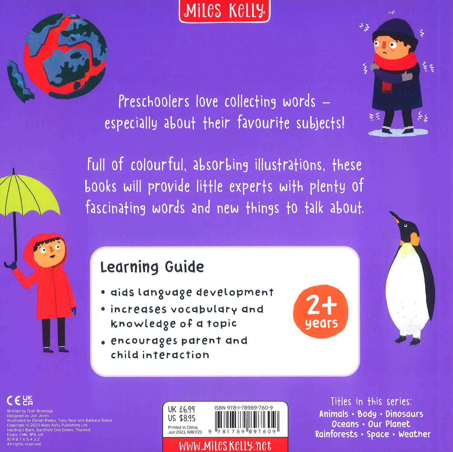 Learn all the need-to-know words for a preschooler’s favourite subject with this absorbing book. Packed with colourful illustrations, appealing words and plenty to talk about, a spectacular adventure around the world starts here. Little experts will thoroughly enjoy discovering the big words as they explore the illustrations with their grown-up.