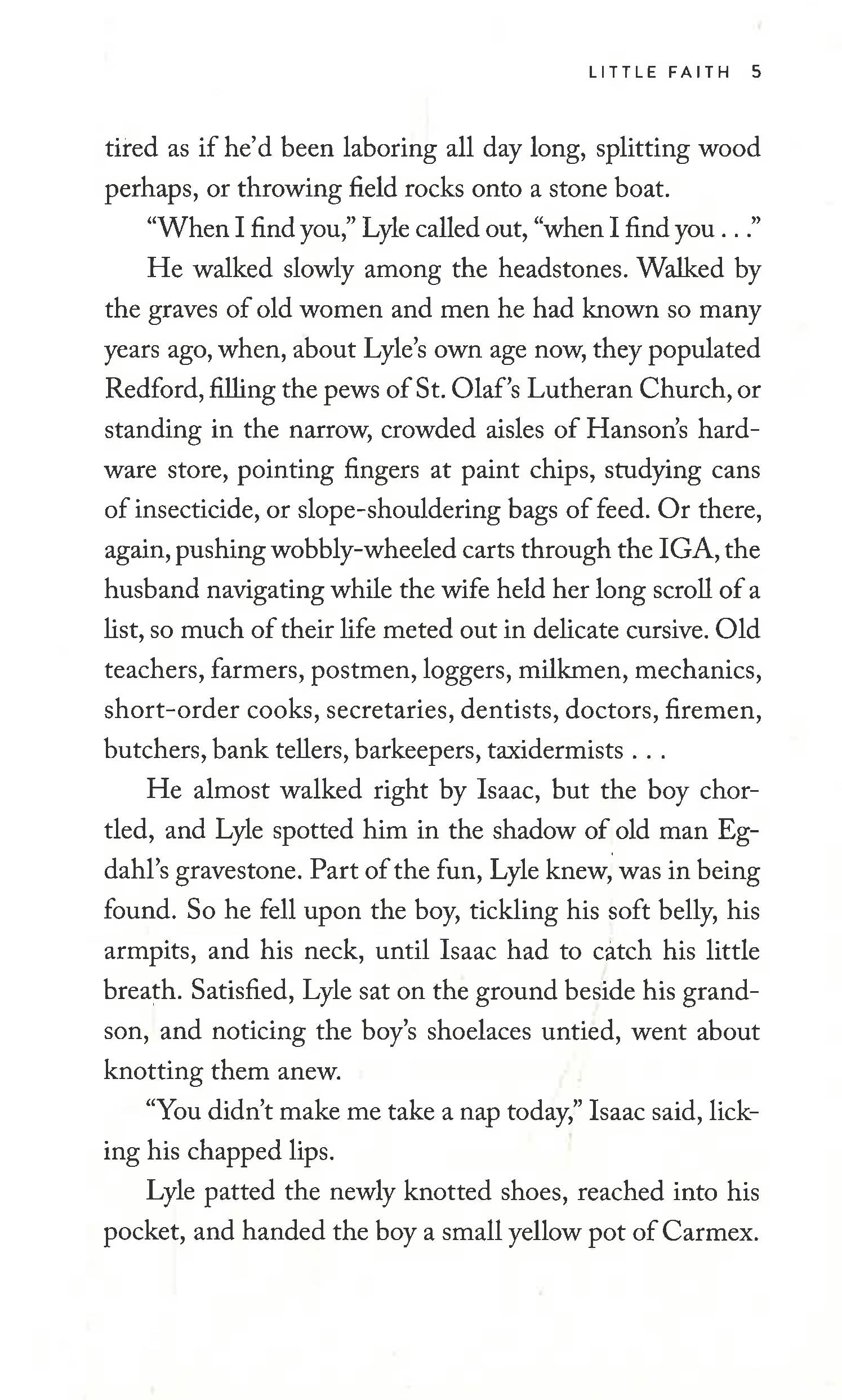 Set over the course of one year and beautifully evoking the change of seasons, Little Faith is a powerful and deeply affecting novel about family and community, the ways in which belief is both formed and shaken, and the lengths we go to protect our own.