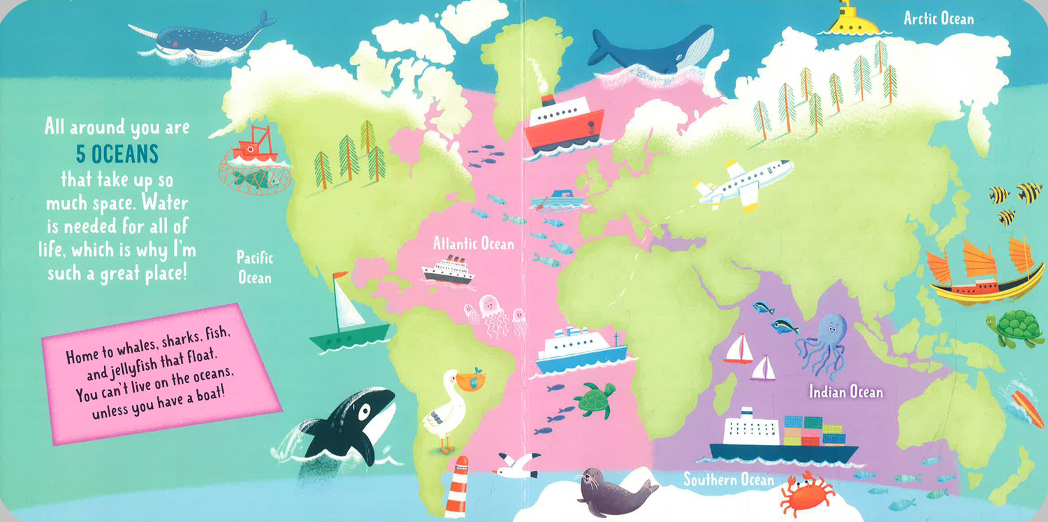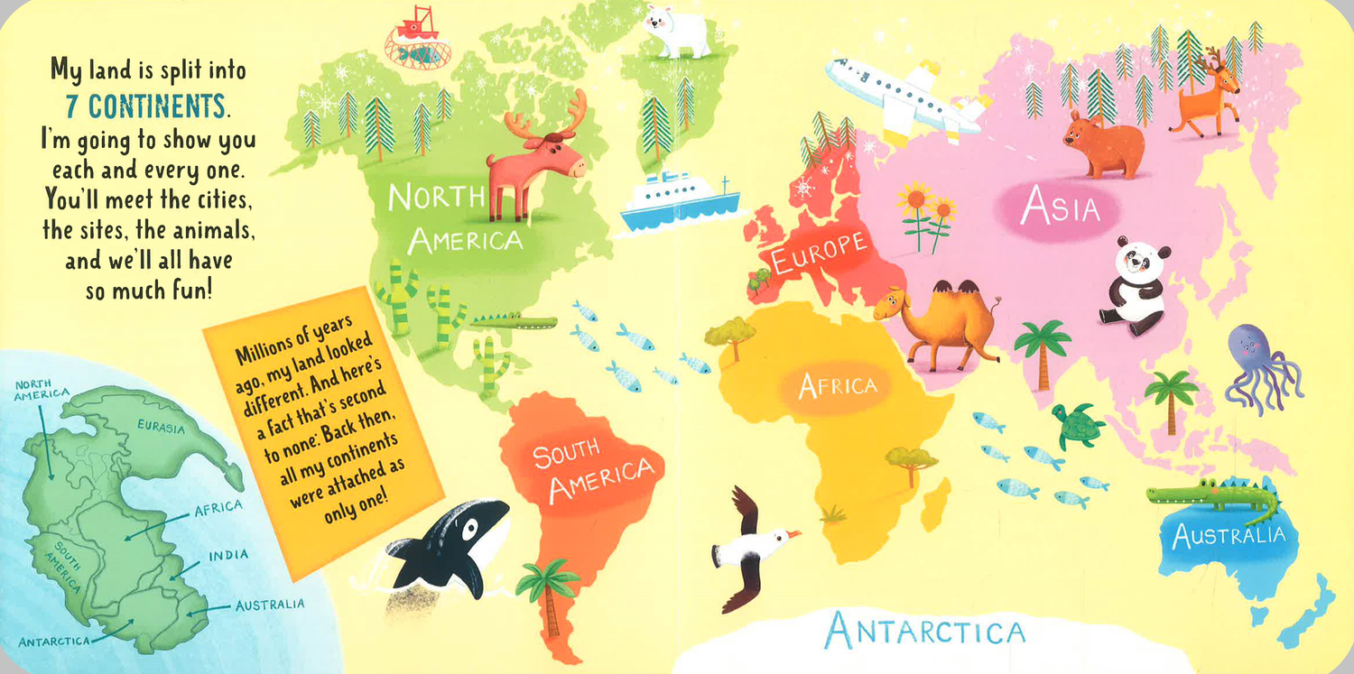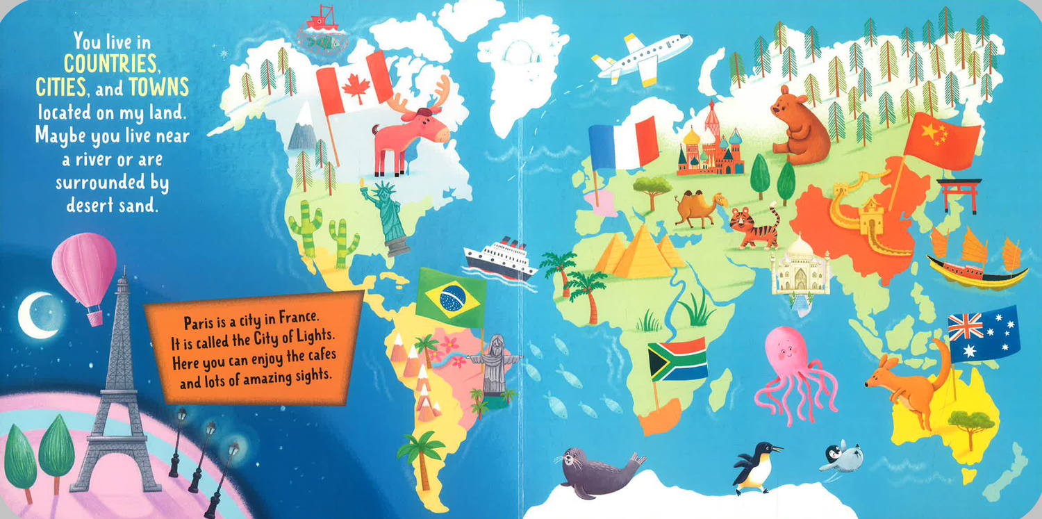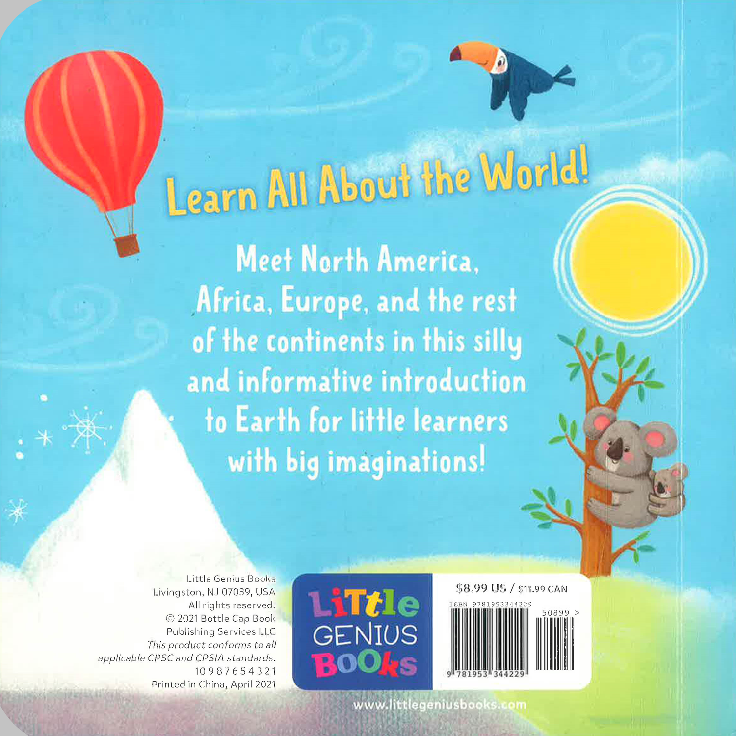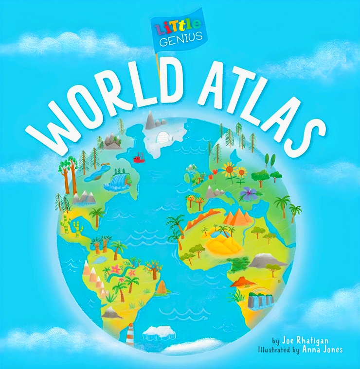 A fantastic and age-appropriate journey around the world for our youngest explorers! With super-simple concepts about continents, animals, oceans, countries, the world’s natural wonders, and man-made marvels, Little Genius World Atlas delights as it entertains. With Earth as your guide, little learners are introduced to the oceans, each continent, and even ecosystems with wonderful illustrations and gentle, rhyming text. Each continent features a fact or two along with fun illustrations of the animals and attractions that make the continents distinctive.