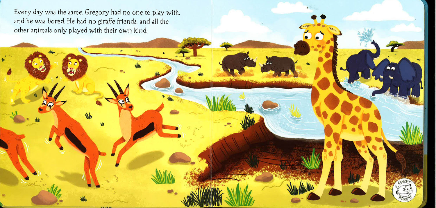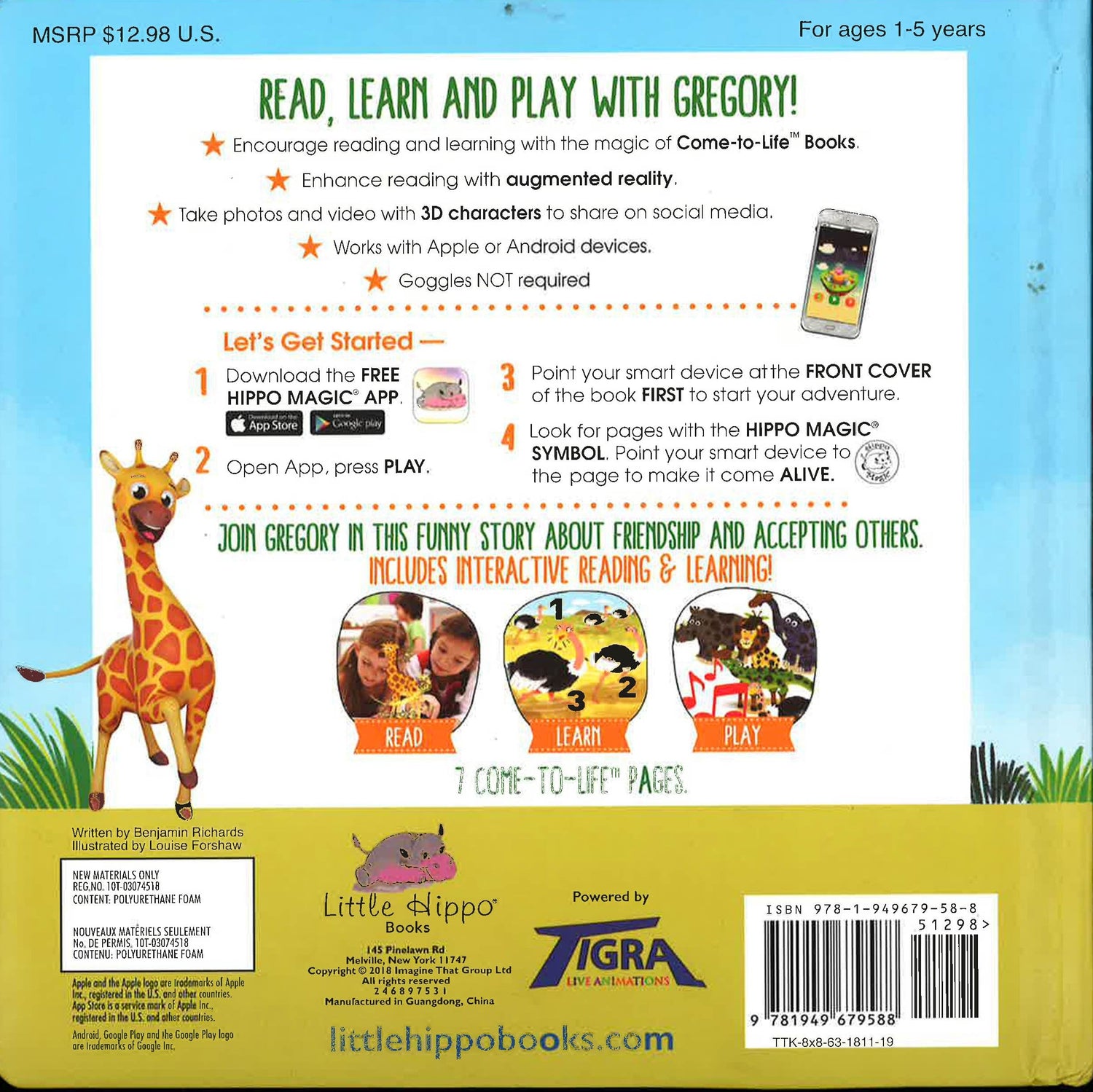 Far, far away, lived a little giraffe called Gregory who had no one to play with. Watch as Gregory dresses up like the other animals to try to fit in. Your little ones can join in by counting and coloring the animals, playing hide and seek and more. whilst learning about friendship and accepting others in this tale. Little Hippo Augmented Reality "Magic Books" exist at the intersection of gaming and reading, technology and literacy, imagination and education. Each book comes with a free, downloadable app for mobile devices, the Hippo Magic App. Simply scan the pages of each book with a tablet or smartphone and watch the characters come to life in a 4D way!