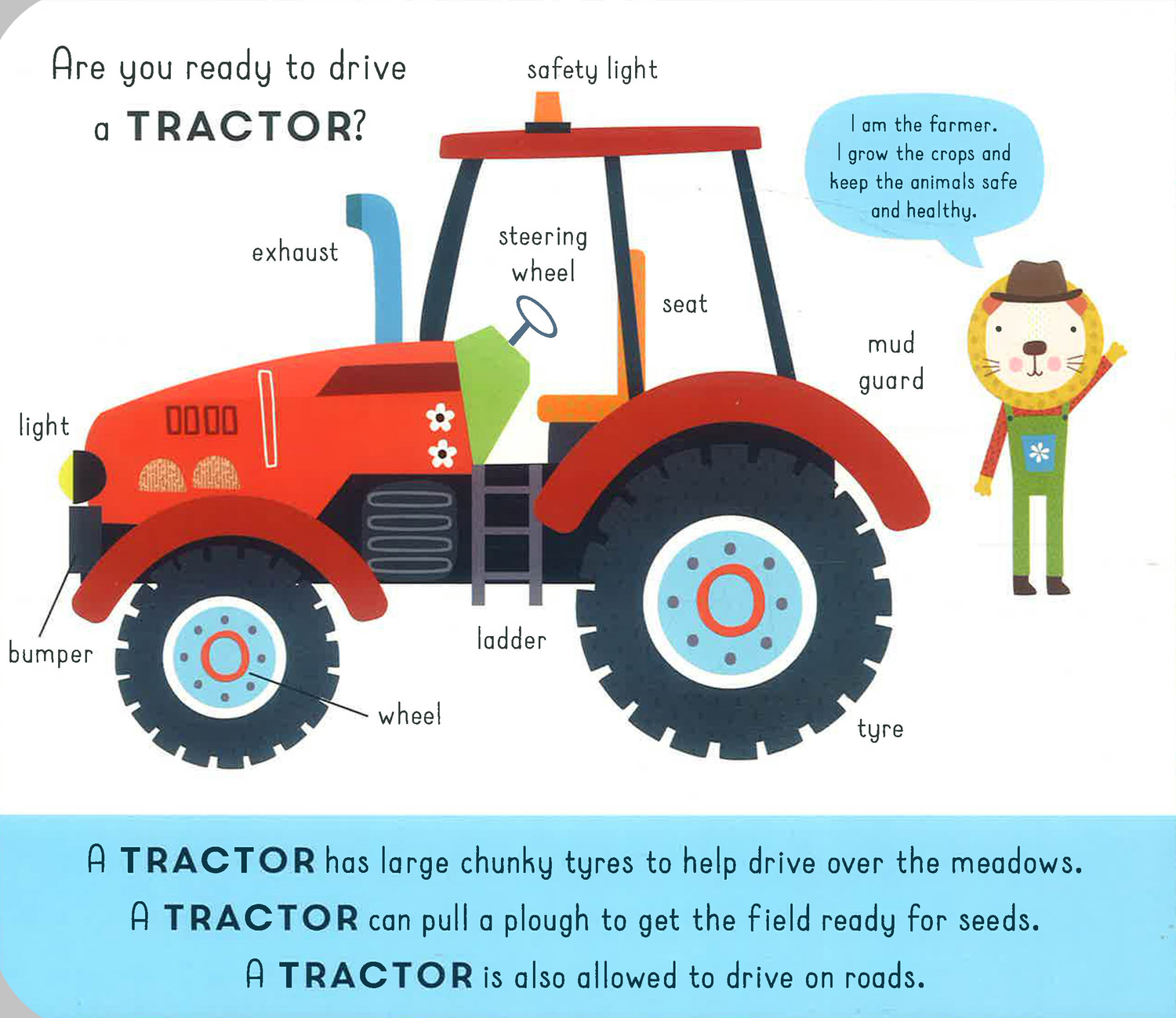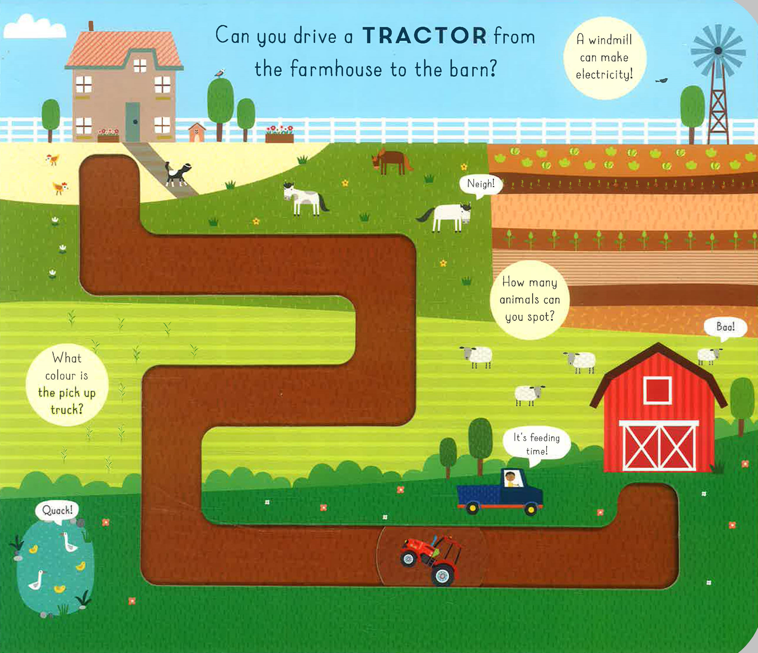 This board book has smooth die cut paths to push the vehicle around and informative text and questions to answer on each spread. Ages 3+
