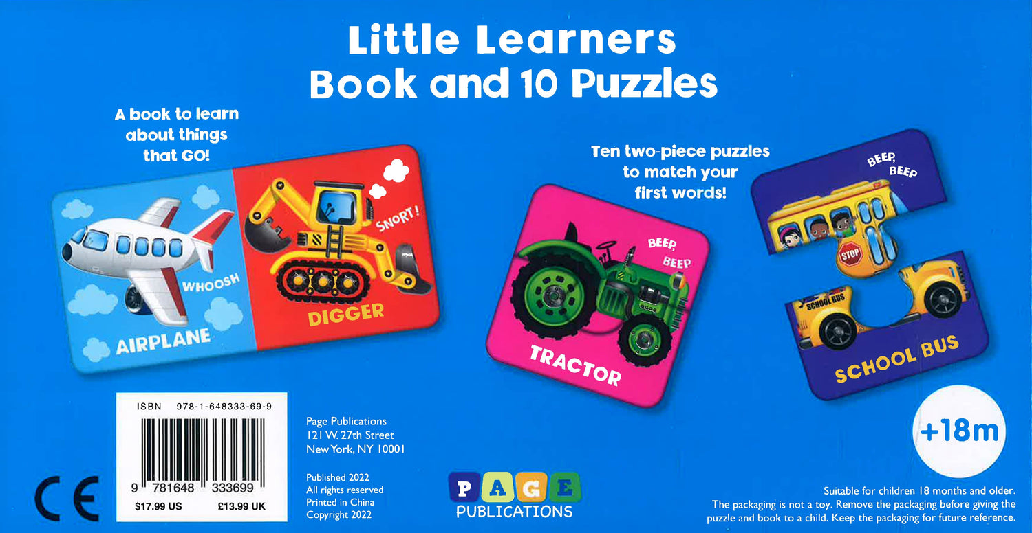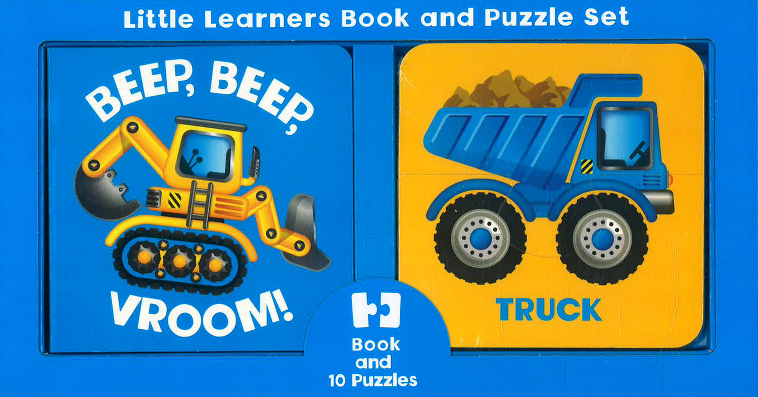 Little Learners Book and 10 Puzzles Set: Beep, Beep Vroom. A book to learn about things that go. Ten two-piece puzzles to match your first words.
