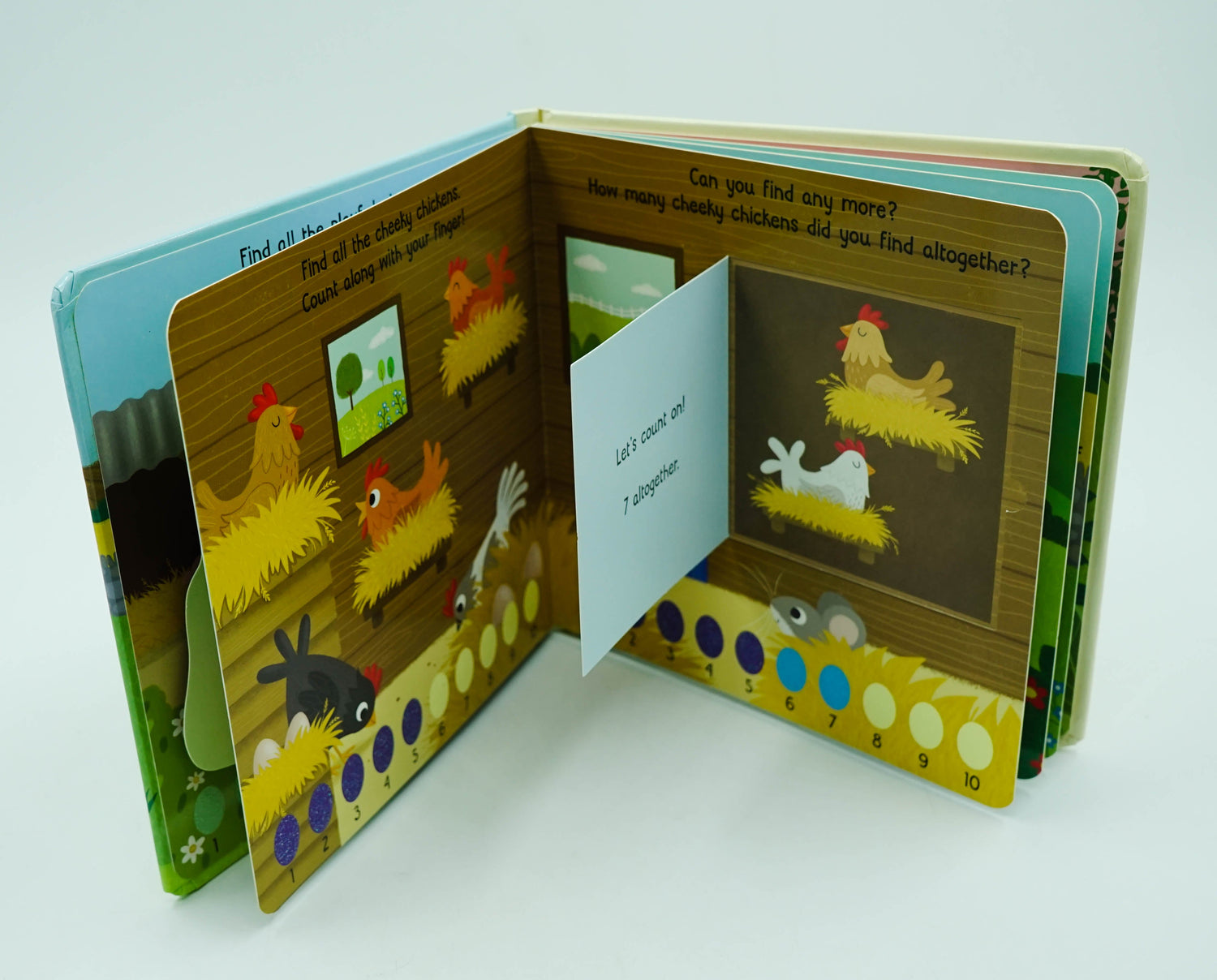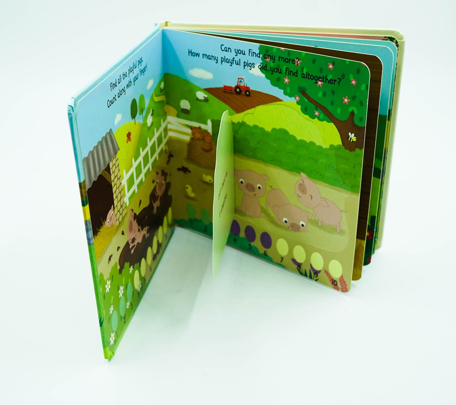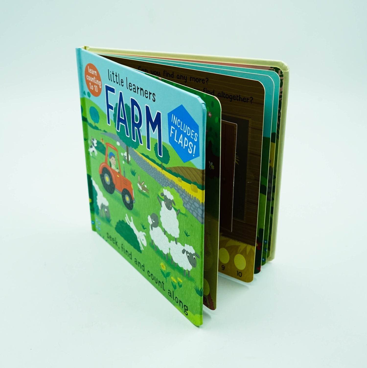 Join little learners on a colorful farm adventure! Look for different animals on the farm and lift the flaps to find hidden items. Seek, find, and count along with this interactive book. Help make learning fun with this farm book for little learners, where they can identify animals and count along with the tactile number strip at the bottom of each beautifully illustrated page. A perfect educational book to help your little one learn to count up to 10