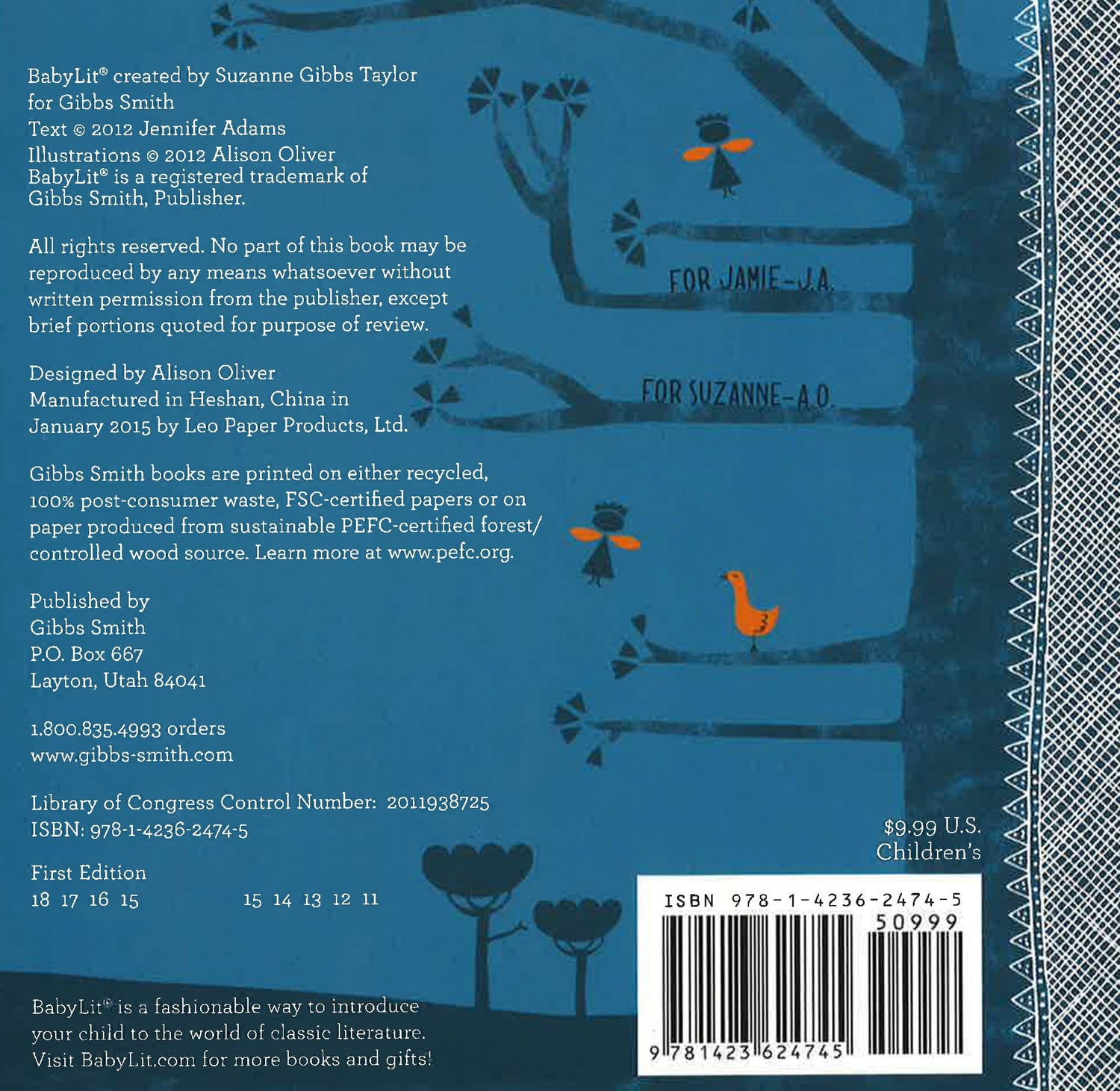 With the perennial popularity of classic writers like Charlotte Brontë and Lewis Carroll, Baby Lit(TM) is a fashionable way to introduce your toddler to the world of classic literature. With clever, simple text by Jennifer Adams, paired with stylish design and illustrations by Sugar's Alison Oliver, Little Miss Brontë is a must for every savvy parent's nursery library.
