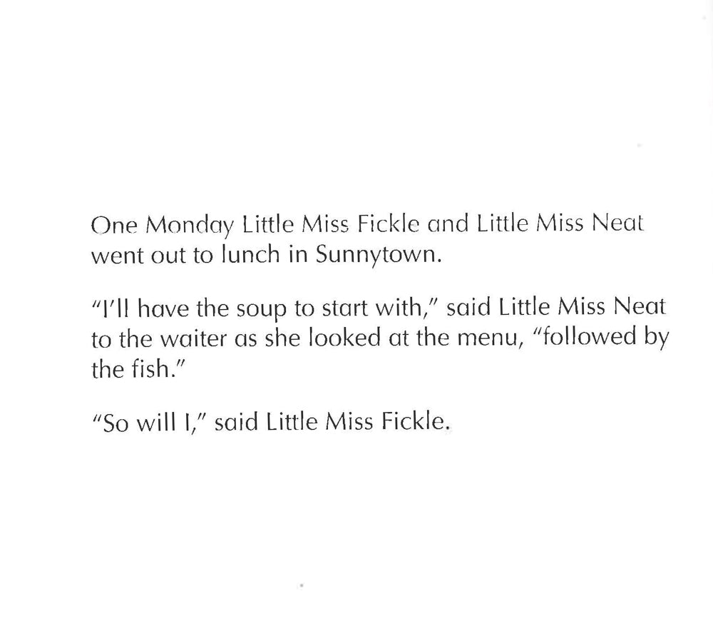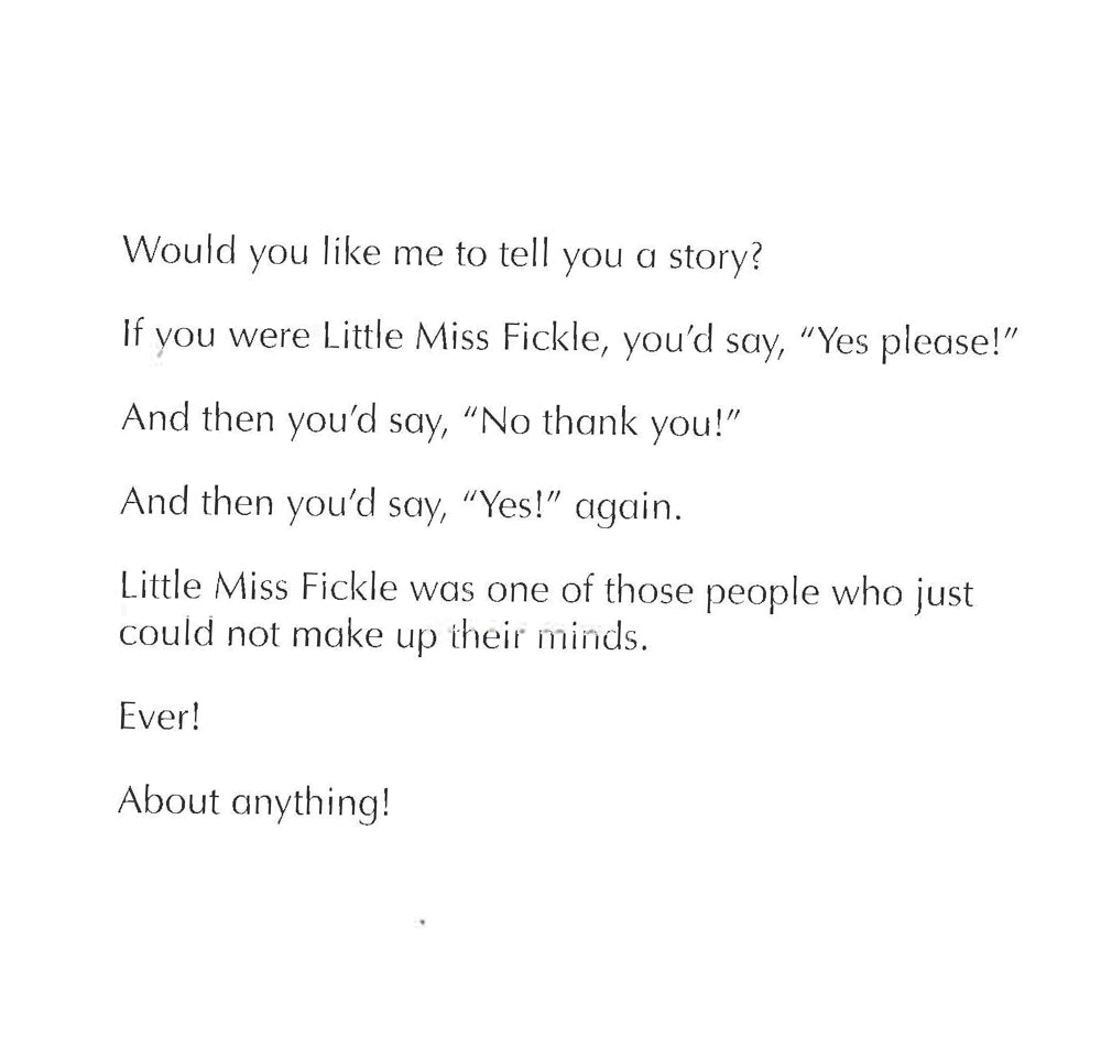 Little Miss Fickle is always changing her mind! The Mr Men and Little Miss have been delighting children for generations with their charming and funny antics. Bold illustrations and funny stories make Mr Men and Little Miss the perfect story time experience for children aged two up. Have you met them all?Little Miss Fickle is always changing her mind! The Mr Men and Little Miss have been delighting children for generations with their charming and funny antics. Bold illustrations and funny stories make Mr Men and Little Miss the perfect story time experience for children aged two up. Have you met them all?