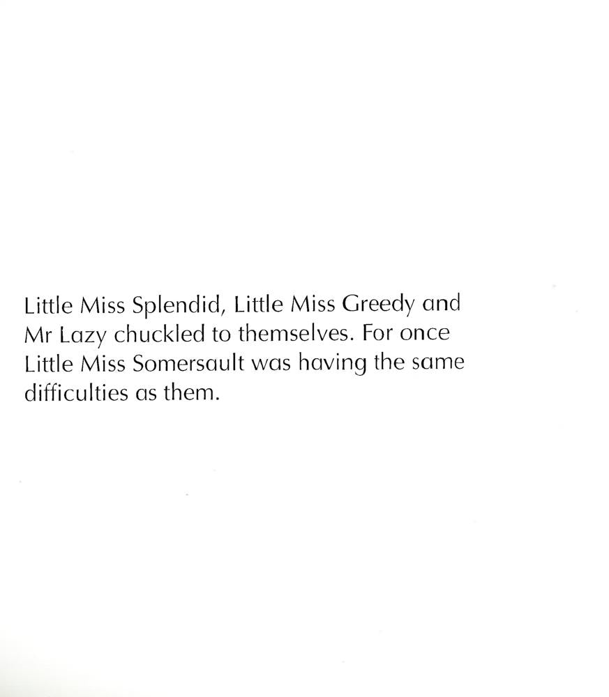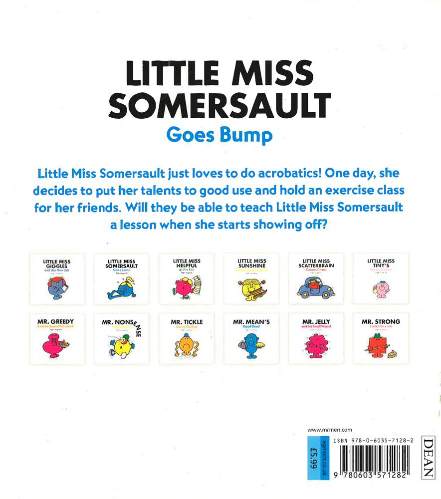 Little Miss Somersault just loves to do acrobatics! One day, she decides to put her talents to good use and hold an exercise class for her friends.Will they be able to teach Little Miss Somersault a lesson when she starts showing off??