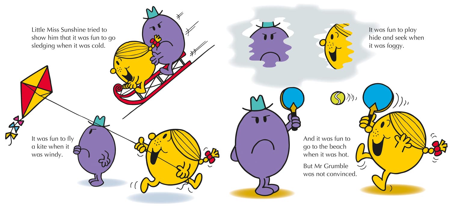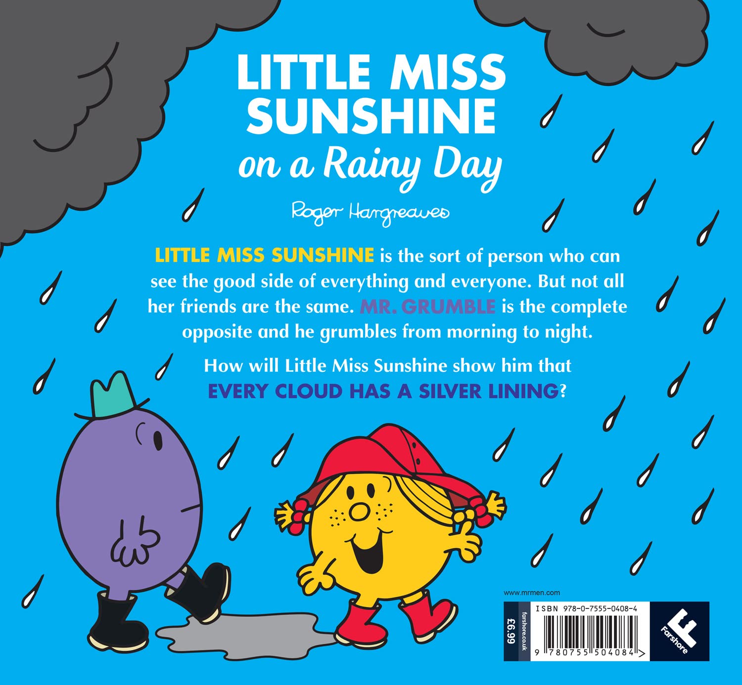 Little Miss Sunshine is the sort of person who can see the good side of everything and everyone. But not all her friends are the same. Mr Grumble is the complete opposite and he grumbles from morning to night. How will Little Miss Sunshine show him that every cloud has a silver lining?