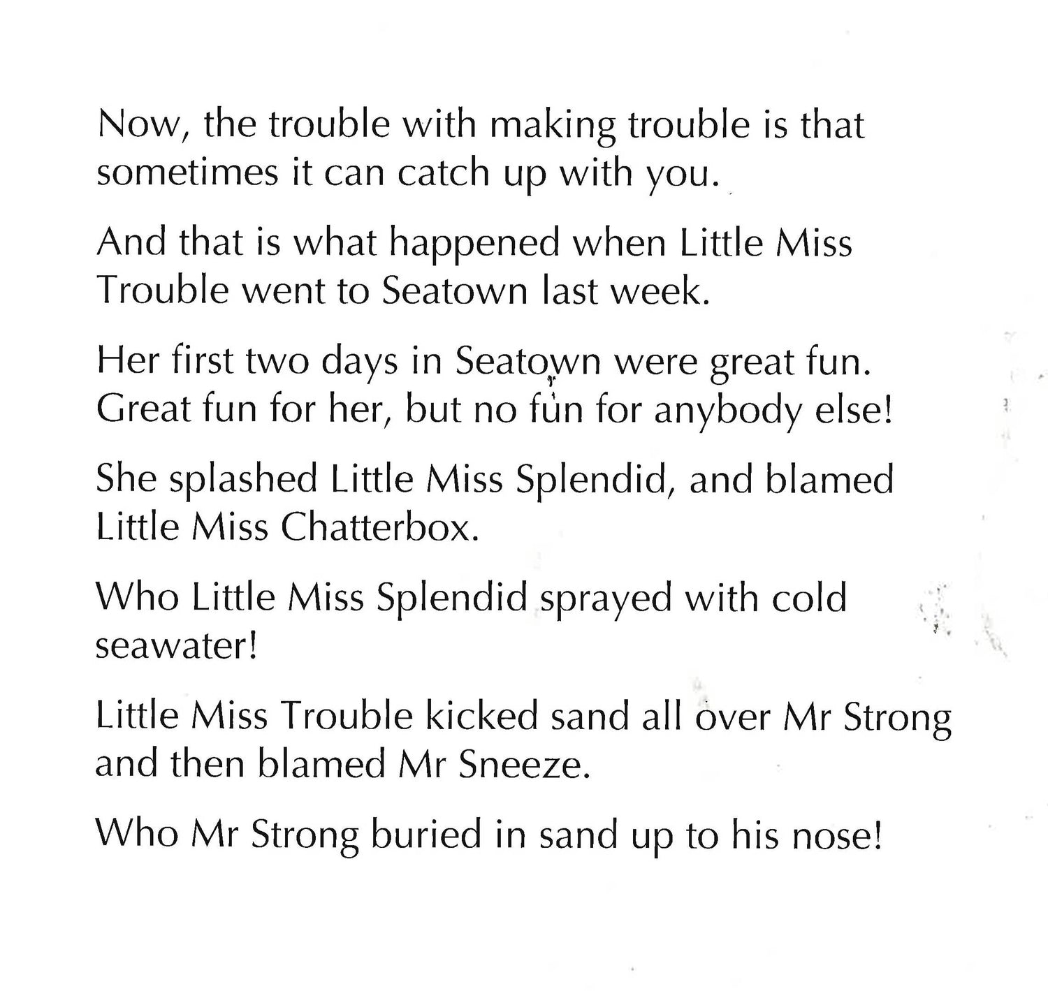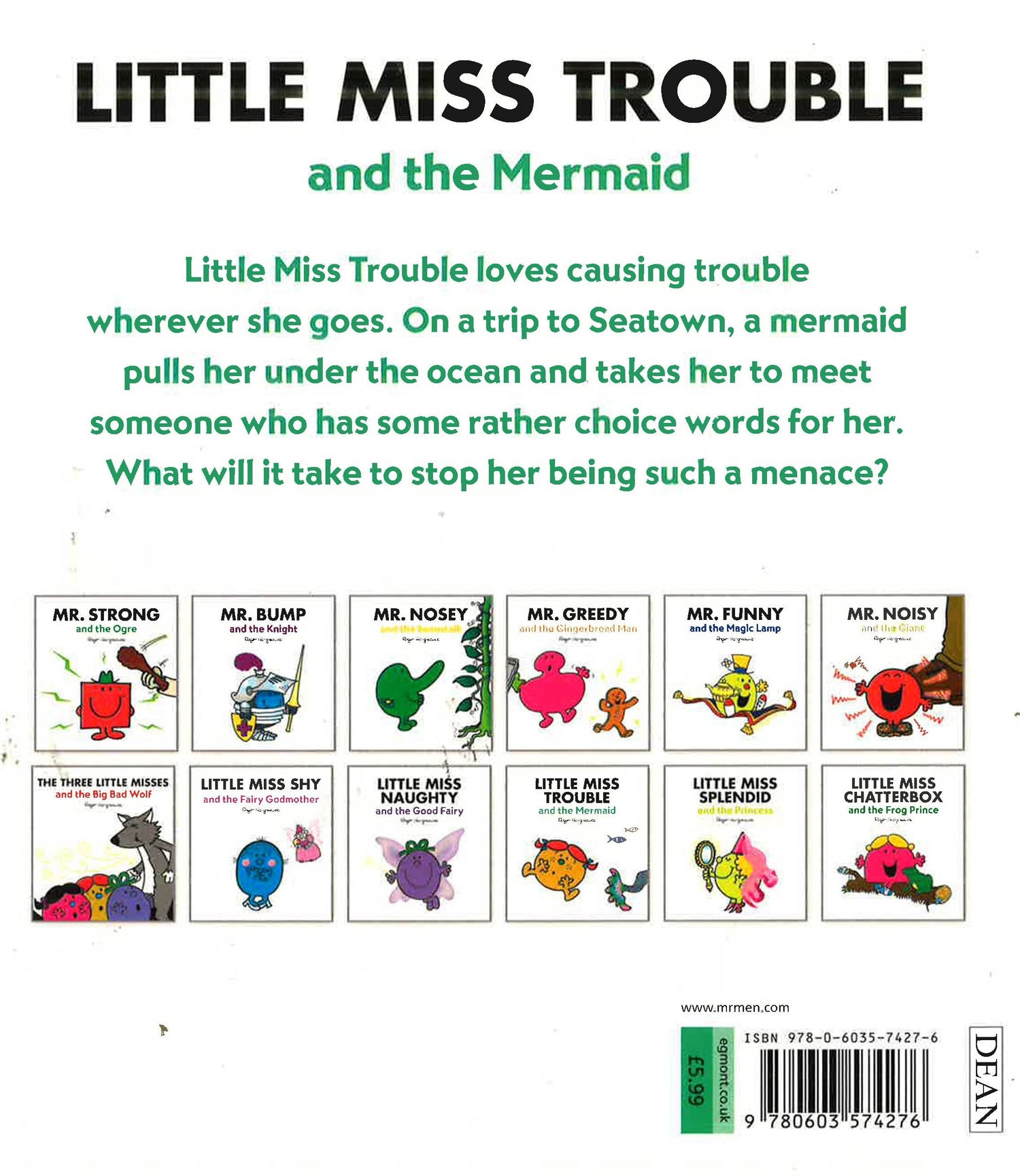 Little Miss Trouble just loves causing trouble for all the Mr. Men! But when she causes too much trouble at the beach one day, a mermaid decides to teach her a lesson.