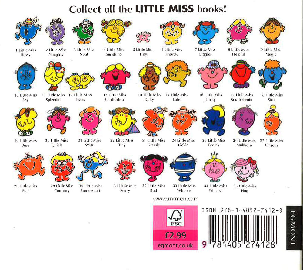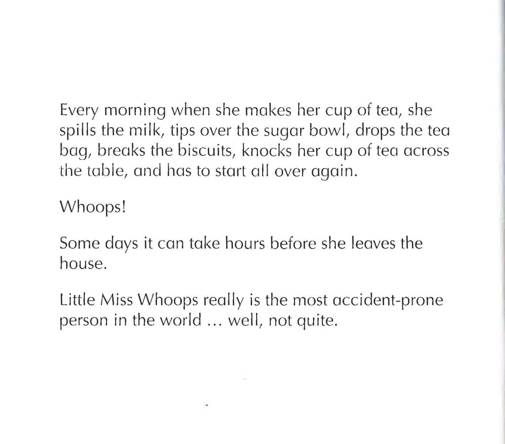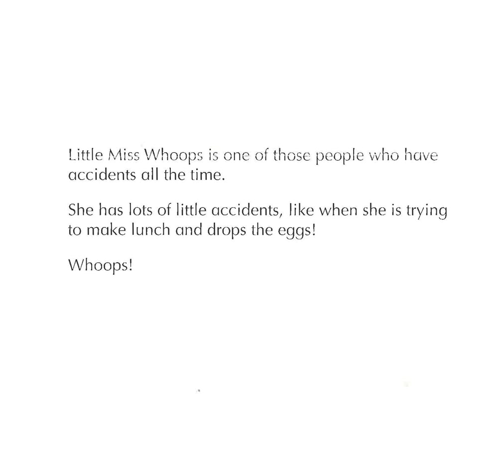 Little Miss Whoops is always having accidents. One day she is visiting her brother, Mr Bump when disaster strikes!Little Miss Whoops is always having accidents. One day she is visiting her brother, Mr Bump when disaster strikes! The Mr Men and Little Miss have been delighting children for generations with their charming and funny antics. Bold illustrations and funny stories make Mr Men and Little Miss the perfect story time experience for children aged two up. Have you met them all? It all started with a tickle. Roger Hargreaves' son Adam asked him what a tickle looked like. In response, Roger drew a small orange man with extraordinarily long arms that could reach anywhere and tickle anyone. Mr Tickle, the first of the Mr Men, was born. Mr Tickle was soon joined by Mr. Greedy, Mr. Happy, Mr. Nosey, Mr Sneeze and Mr Bump. When the first Mr Men books were published they became an instant hit. Roger went on to create many more Mr Men and Little Miss characters. What Roger really wanted was to make children laugh, which is probably why his own favourite character is Mr Silly.