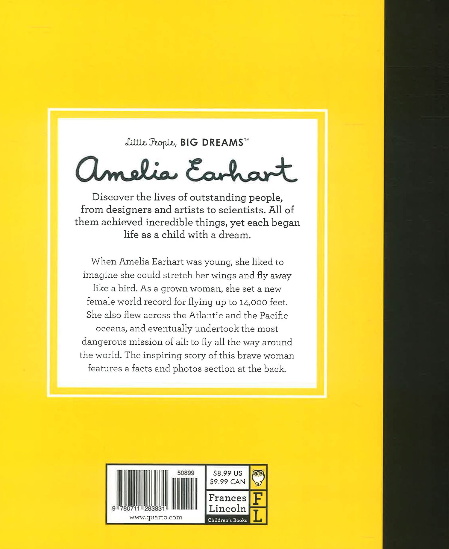 When Amelia was young, she liked to imagine she could stretch her wings and fly away like a bird. As a grown woman, she set a new female world record for flying up to 14,000 feet. She also flew across the Atlantic and the Pacific oceans, and eventually undertook the most dangerous mission of all: to fly all the way around the world. This moving book features stylish and quirky illustrations and extra facts at the back, including a biographical timeline with historical photos and a detailed profile of the aviator's life.