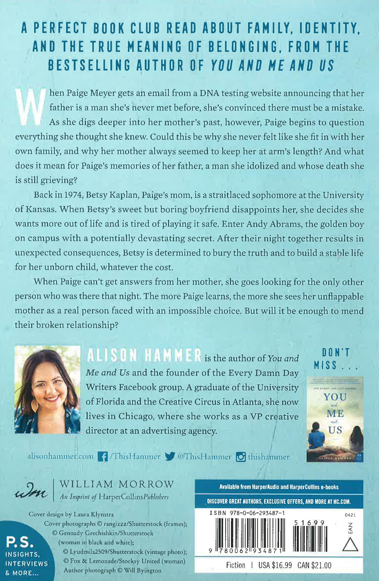 Following her acclaimed debut novel, You and Me and Us, Alison Hammer offers a deeply moving story of family and identity. When a DNA test reveals a long-buried secret, a woman must look to the past to understand her mother and herself.
