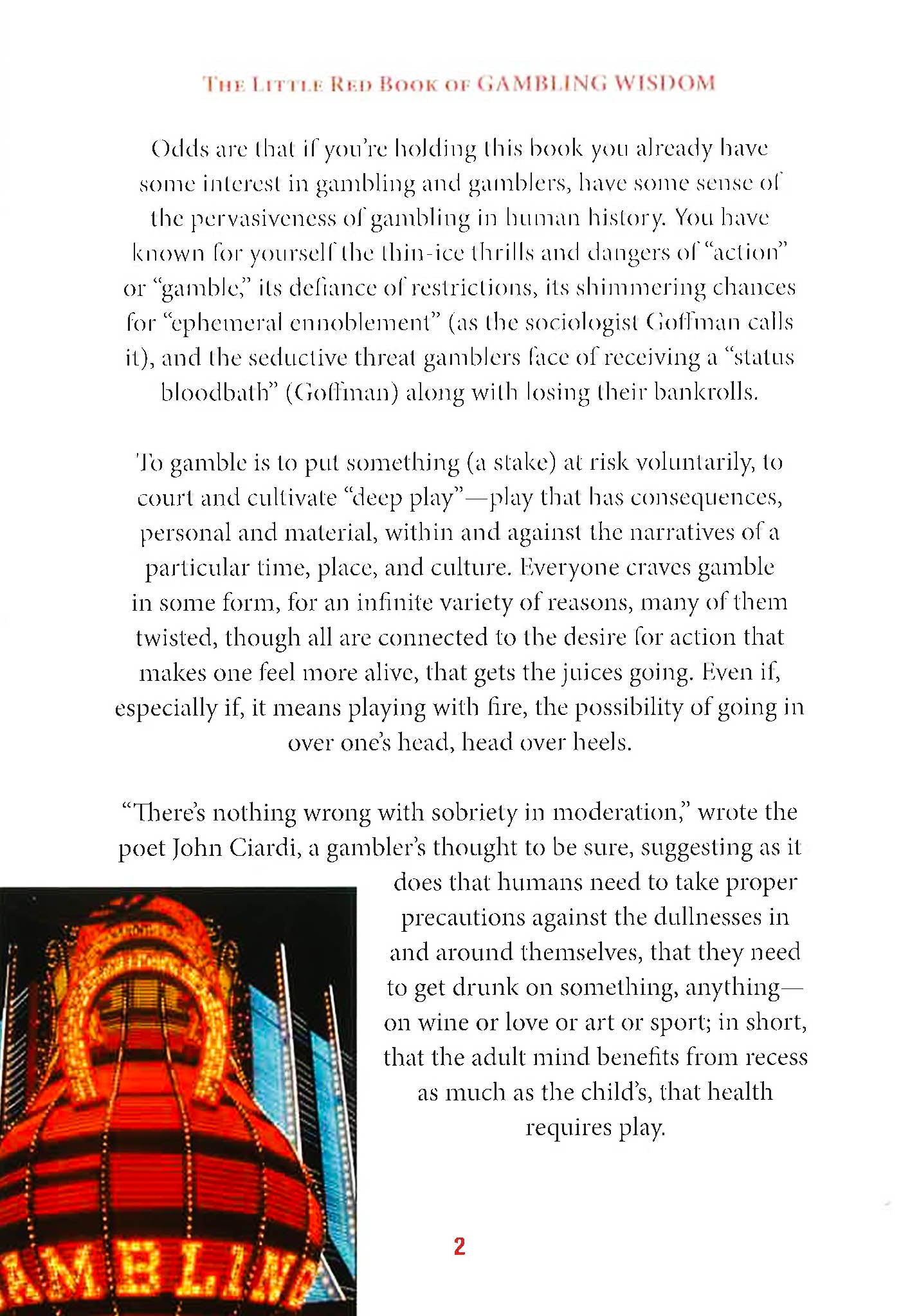 From Casablanca to The Hustler, from Moby Dick to How I Made $1,000,000 Playing Poker, these widely varied musings address the entire range of human emotion-the highs of excitement of the "juice" down to the depths of despair of losing. Covered here are gaming's universality and history, superstition and luck, players and places, and also every game, from the lowliest back-alley crap shoot to the highest-stakes poker contest and everything in between.You'll find quotable phrases from luminaries like Plato and Tom Wolfe, along with the hard-scrabble advice of Minnesota Fats and Nick the Greek, and humor and pith from the likes of Woody Allen, Charles Bukowski, David Mamet, Groucho Marx, Hunter S. Thompson, and many, many more!