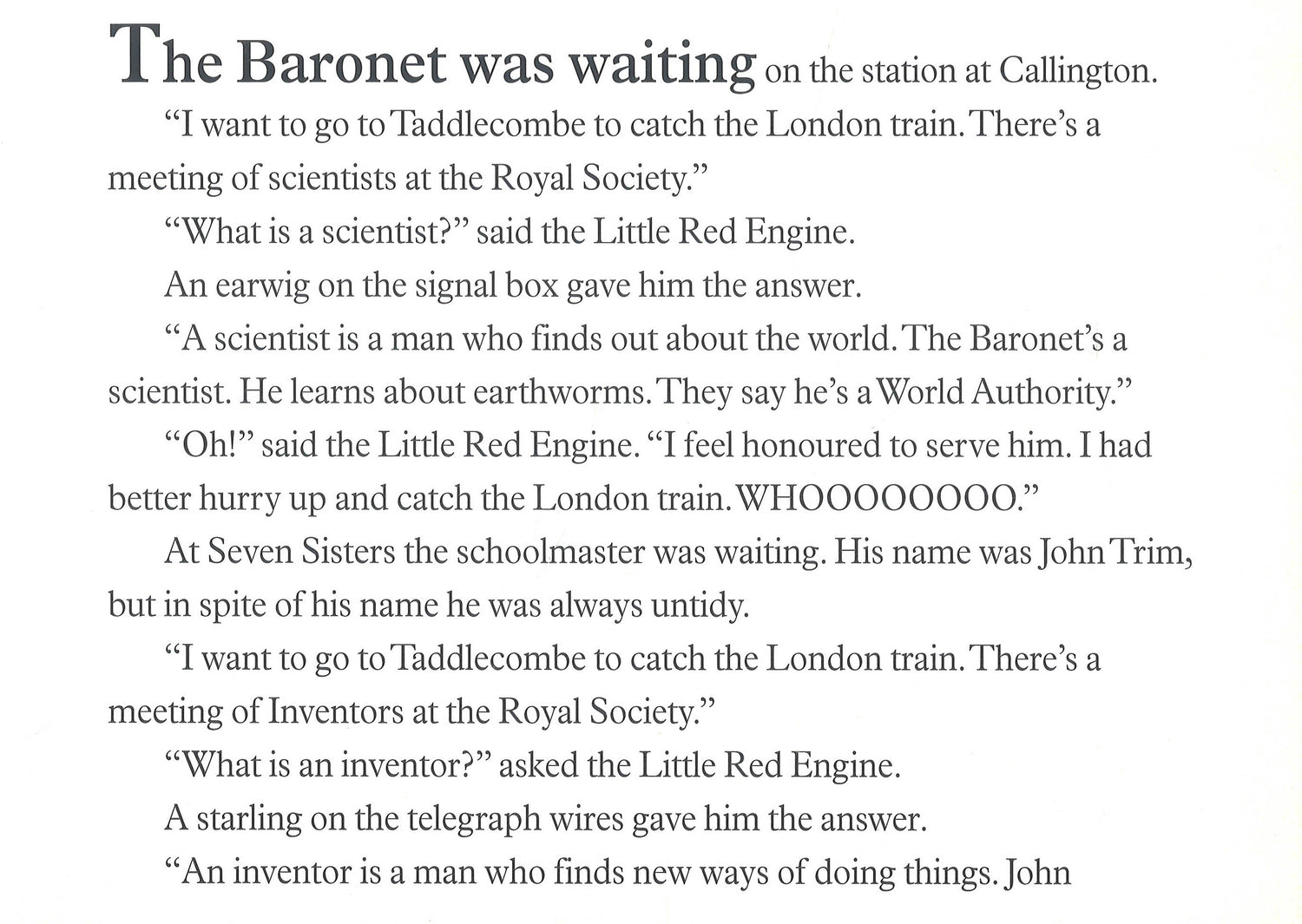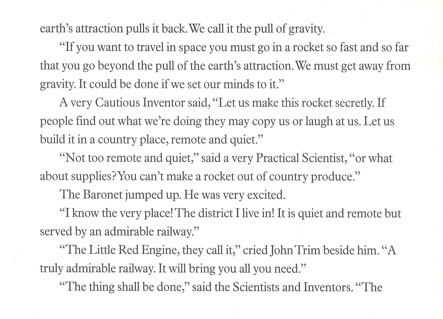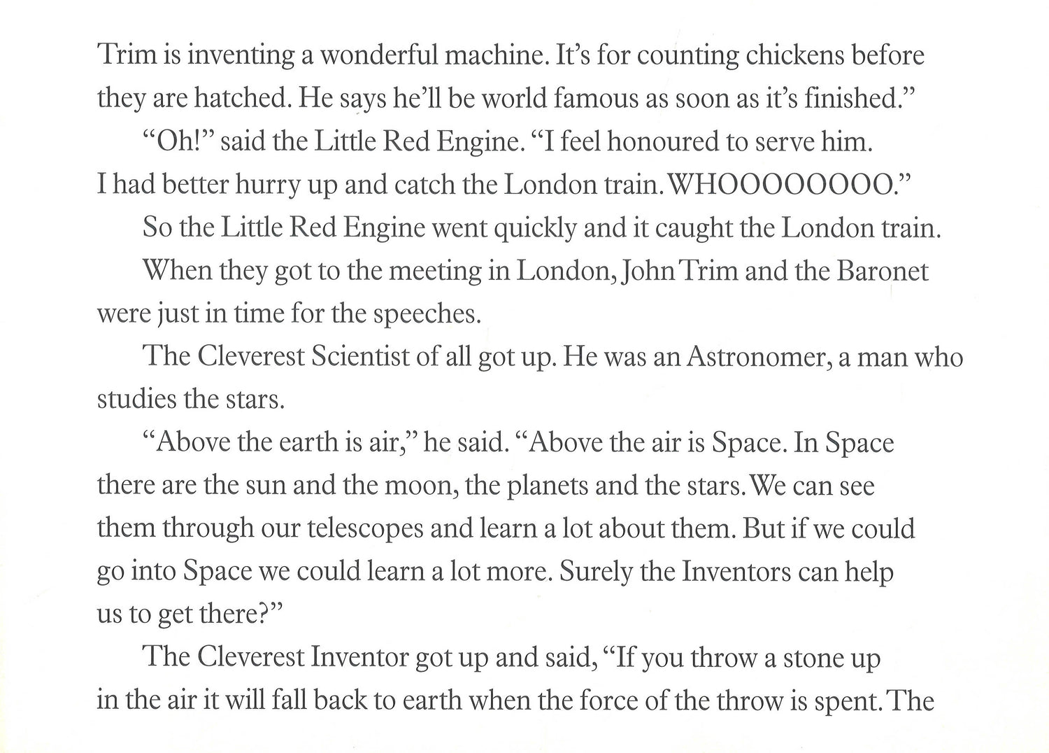 The Little Red Engine is very busy and excited, carrying everyone backwards and forwards to the rocket site. We then see the Big Red Rocket blast off, carrying the very first space passengers.