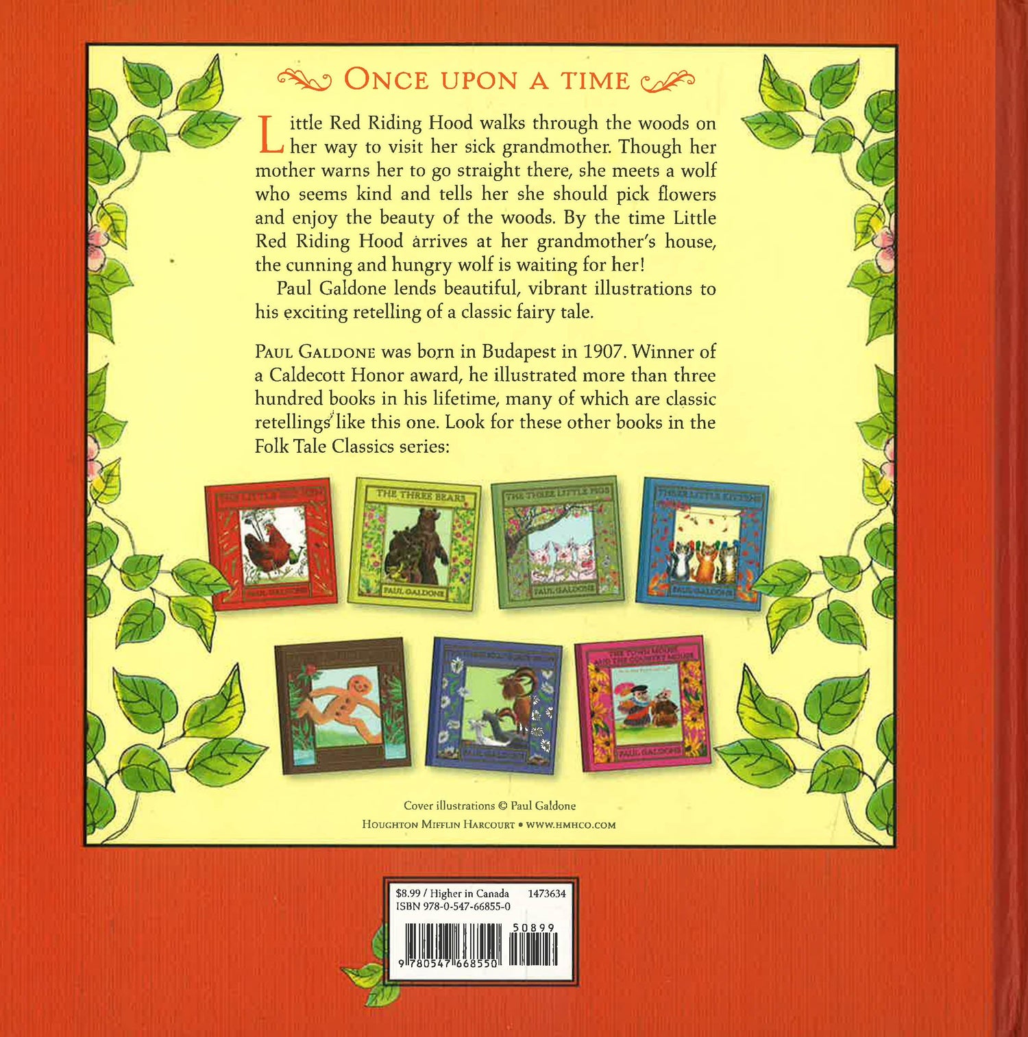 "Once upon a time there was a sweet little maiden who was loved by all who knew her..." So begins this classic tale about Little Red Riding Hood and her encounter with the wolf one day when she is on her way to visit her sick grandmother. Paul Galdone has drawn on the Brothers Grimm version of "Little Red Riding Hood", and lends beautiful, vibrant illustrations to his exciting retelling of this classic fairy tale. Small children and Paul Galdone's older fans will cheer as the old tale comes enchantingly alive in lovely, nostalgic, full-colour pictures.