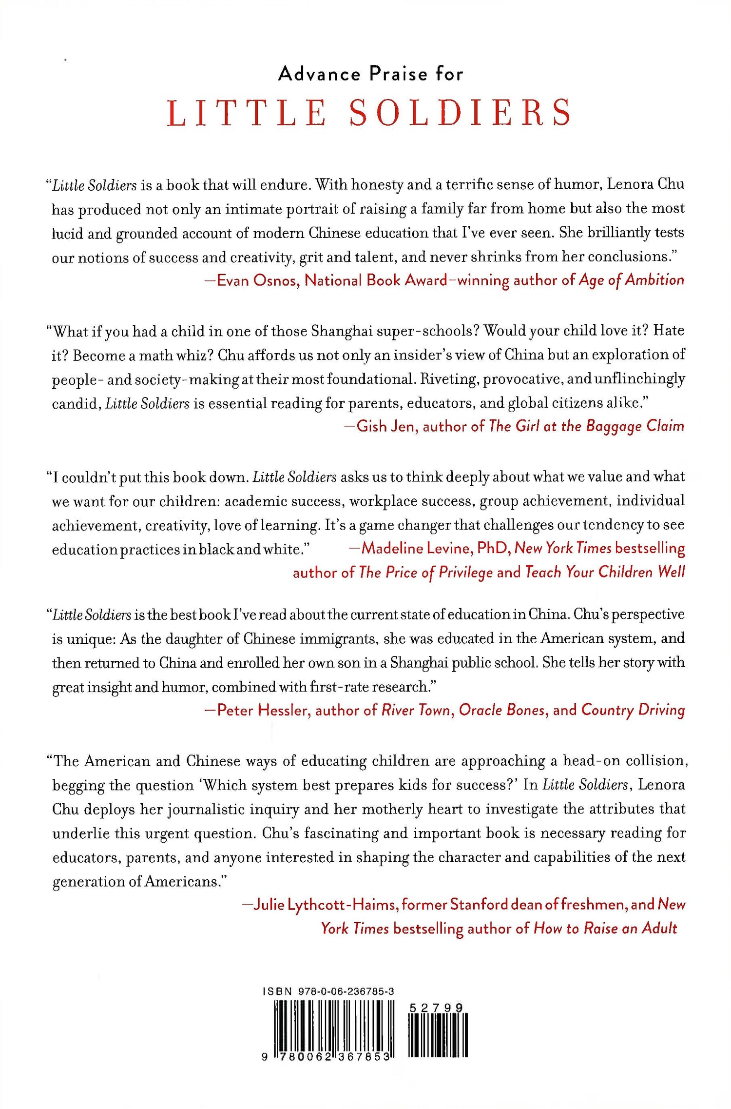When American journalist Lenora Chu moved to Shanghai with her little boy, Rainey, just down the street from the state-run school - the best, as far as elite Chinese were concerned - she faced an important decision: Should she entrust her rambunctious young son to the Chinese public schools?It seemed like a good idea at the time, and so began Rainey’s immersion in one of the most radical school systems on the planet. Almost immediately, the three-year-old began to develop surprising powers of concentration and became proficient in early math. Yet Chu also noticed disturbing new behaviors: Whereas he used to scribble and explore, Rainey was now obsessed with staying inside the lines. He became fearful of authority figures. "If you want me to do it, I’ll do it," he told a stranger who had asked whether he liked to sing.Driven by parental concern, Chu embarked on an investigative mission: What price do the Chinese pay to produce their "smart" kids, and what lessons might Western parents and educators learn from this system? In her search for answers, Chu followed Chinese students, teachers, and experts, pulling back the curtain on a military-style education system in which even the youngest kids submit to high-stakes tests and parents are crippled by the pressure to compete. Yet as Chu delved deeper, she discovered surprising upsides, such as the benefits of memorization, competition as a motivator, and the Chinese cultural belief in hard work over innate talent.Lively and intimate, beautifully written and reported, Little Soldiers asks us to reconsider the true value and purpose of education, as China and the West compete for the political and economic dominance of a new generation.