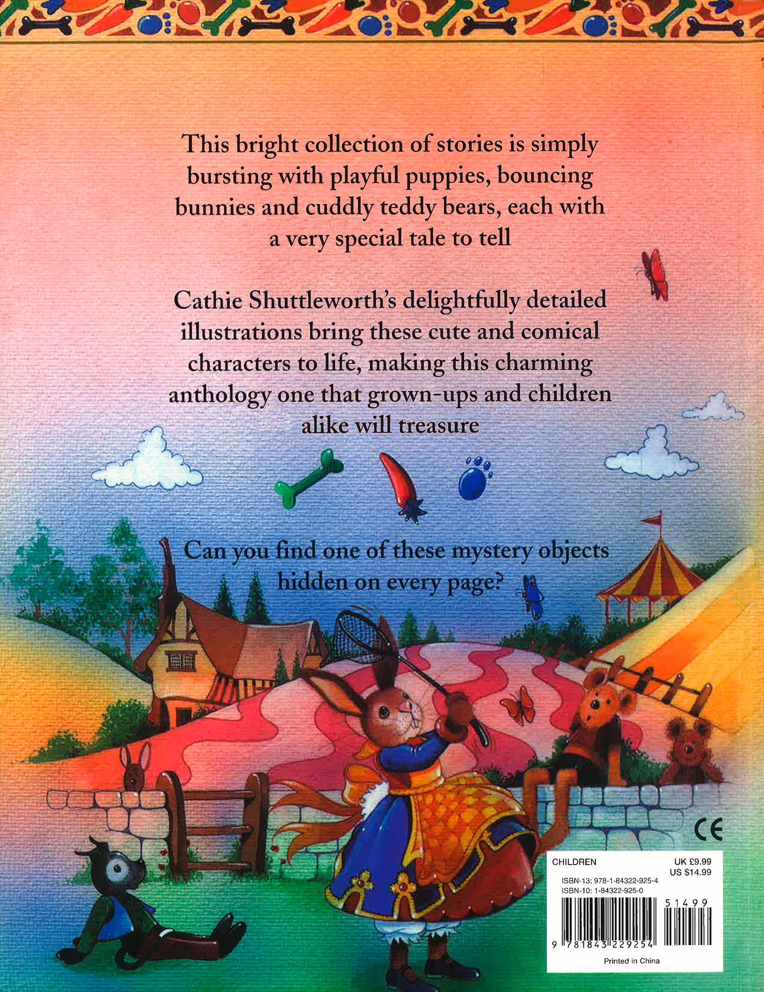 This title feature 35 stories about adorable teddy bears, puppies and bunnies. This bright collection of stories is simply bursting with playful puppies, bouncing bunnies and cuddly teddy bears, each with a very special tale to tell. You can find out where all the little lost bears end up, what happens when a bunny rabbit gets too friendly with a fox, what became of Duchess Dulay's missing diamond bracelet, and whether Mr Terrier the teacher really had a close encounter with an alien life form. Cathie Shuttleworth's delightfully detailed illustrations bring these cute and comical characters to life, making this charming anthology one that grown-ups and children alike will treasure. Look out for the pawprints, carrots and bones hidden throughout the book. What really took place at the Teddy Bears' Picnic? What happens when a teddy bear meets a real bear? Are there bears so tiny that you cannot see them at all? Do you know what happens when a bunny eats too much fudge, or tries to make a wedding dress at the very last minute? How come Mrs Gruff the greengrocer is feeling so tired these days? And why was Sir Woofington Paws so pleased to meet a thief in his house? Read this collection of exciting, scary, funny and silly stories about teddy bears, bunnies and puppies, and you will soon find out.