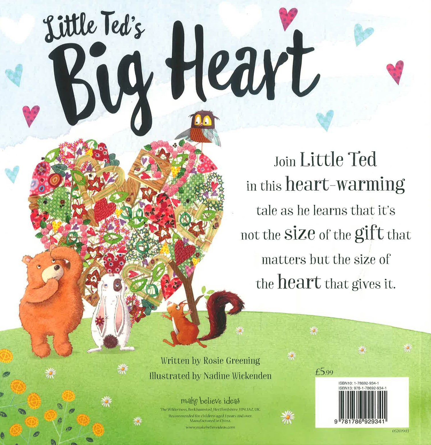 One day, Little Ted makes his friends a big heart to show them how much he loves them. The problem is, the heart is too big to fit down Rabbit's burrow and too heavy for Owl to lift to his nest. All seems lost, until Ted's friends help him see that a gift's size doesn't matter, as long as it comes from the heart.