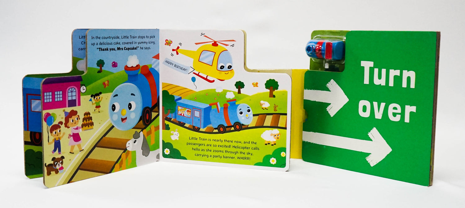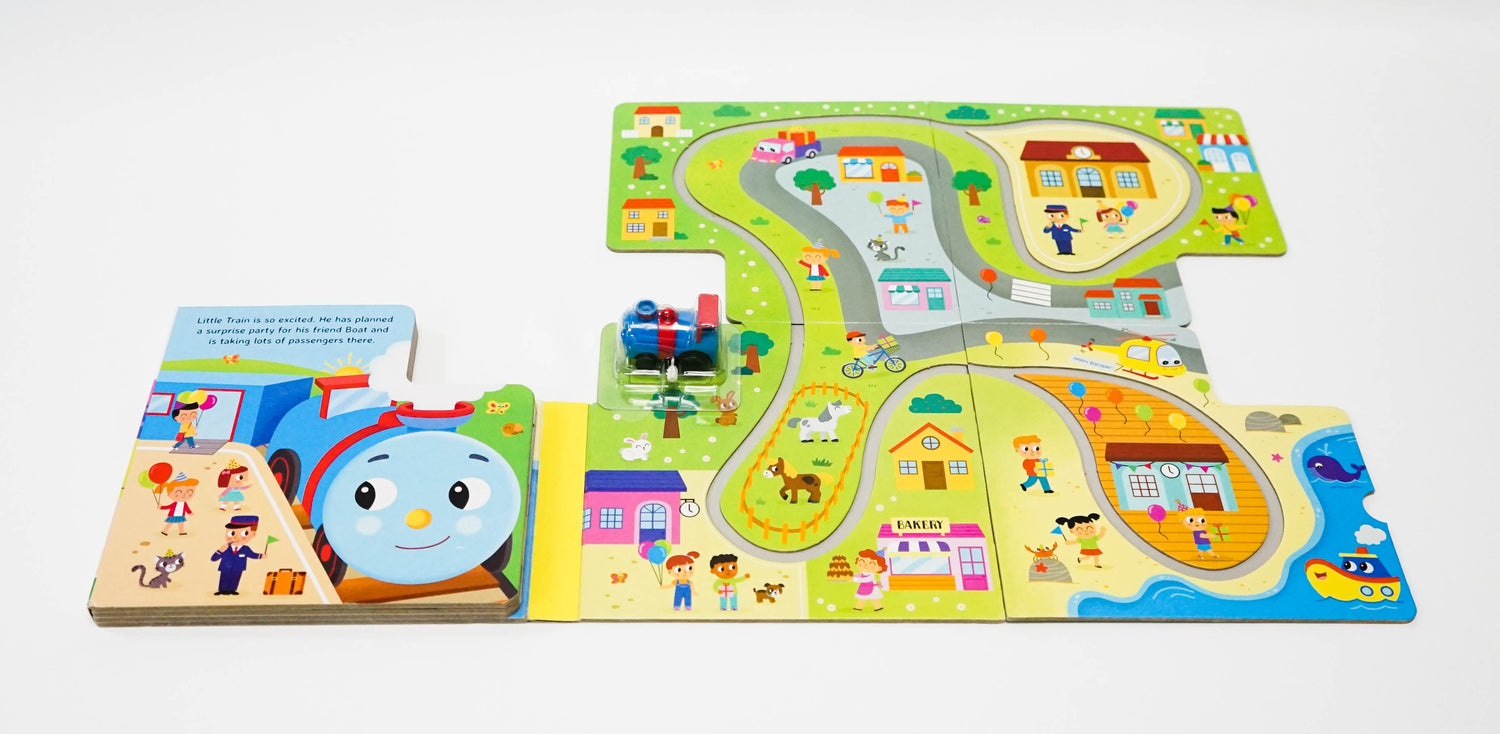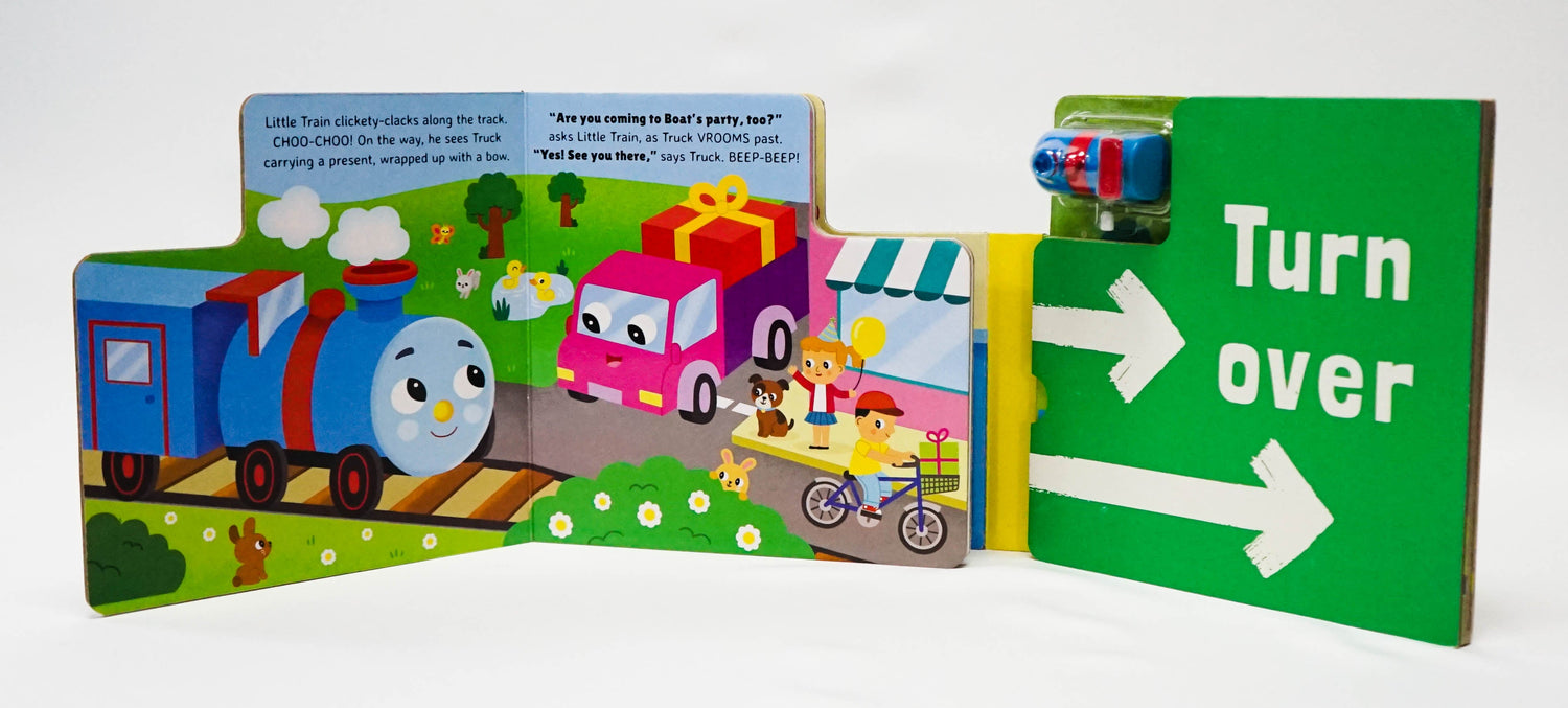 Can Little Train get to Boat's party on time? Find out in this brand-new version of a bestselling title, with a toy train and fold-out track