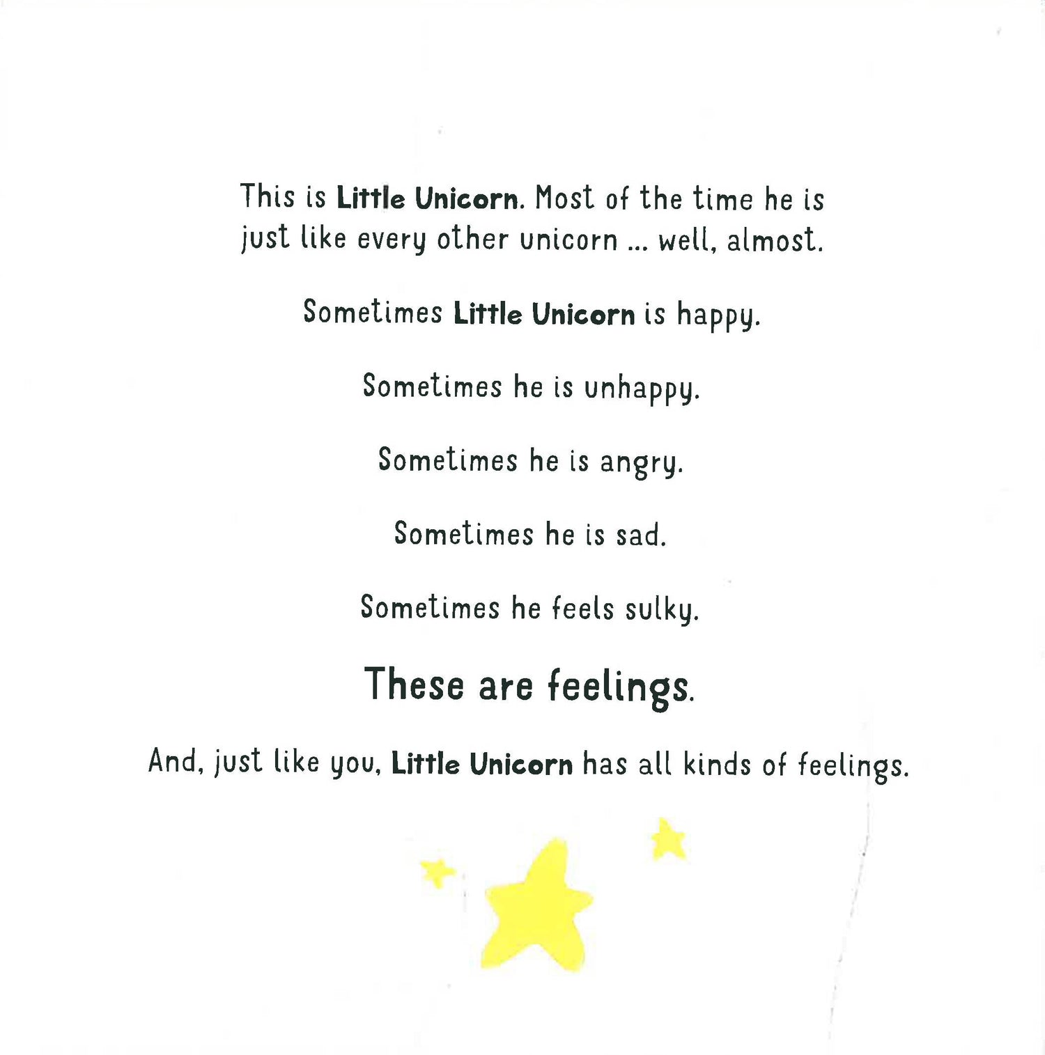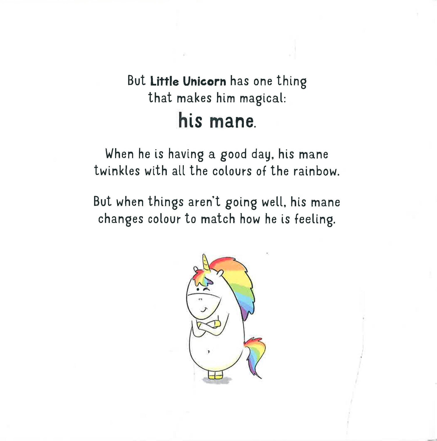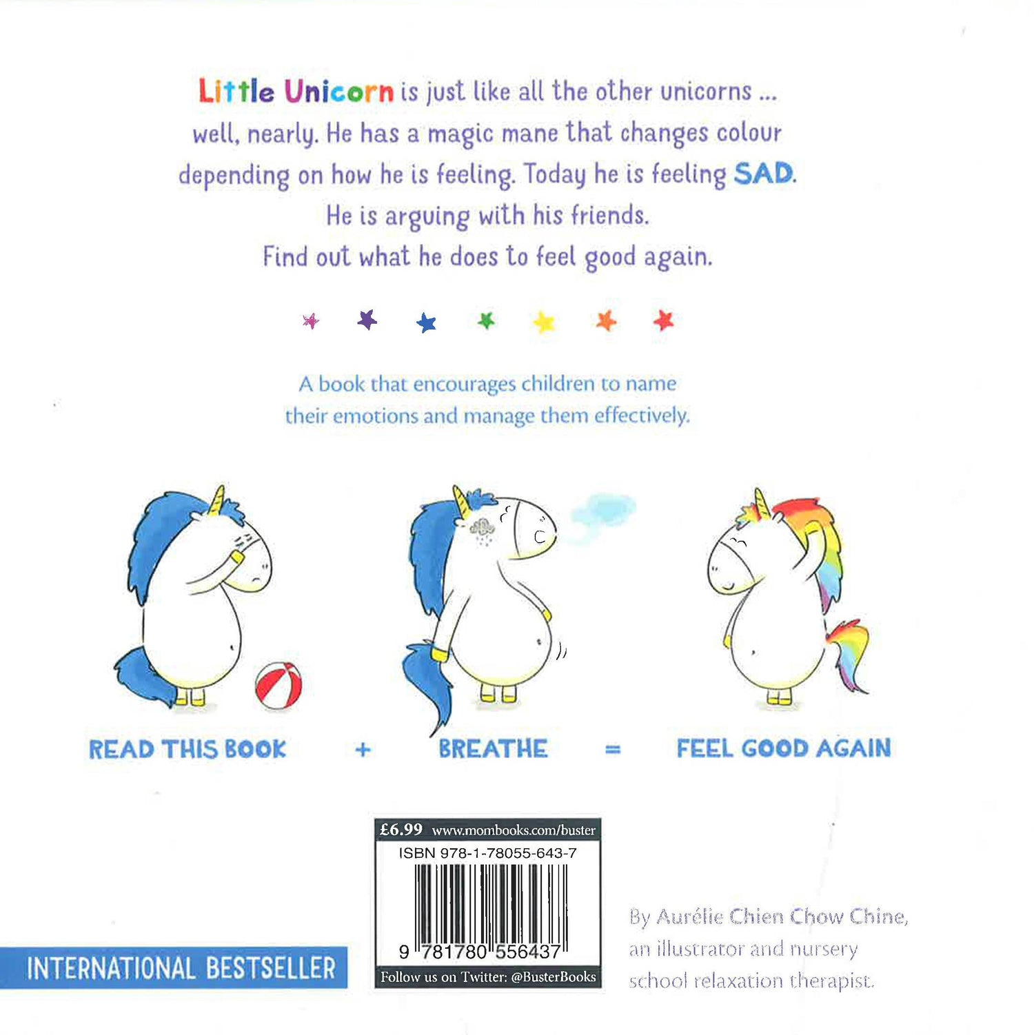 A book that encourages children to name their emotions and manage them effectively using breathing exercises. Little Unicorn is just like all the other unicorns ... well, nearly.He has a magic mane that changes colours depending on how he is feeling.Today he is feeling sad.He is arguing with his friends. Now he feels like he's been invaded by a big grey cloud of sadness.Kids can discover how to chase away sad feelings and feel good again, with easy to master teach yourself calm breathing exercises.Children can join Little Unicorn in a calm-inducing breathing exercise and follow 3 easy steps designed to regulate overwhelming emotions.OTHER BOOKS IN THE SERIES:Little Unicorn is Angry (9781780556420)