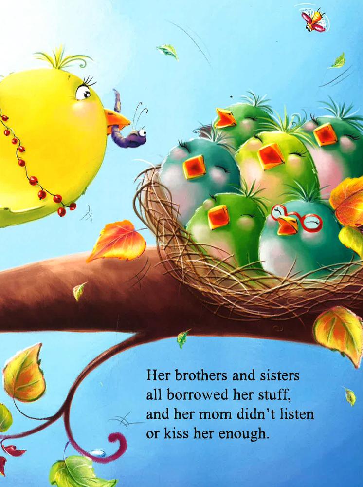 Fed up with being jostled around by all her brothers and sisters and not getting any attention, Littlest Bird goes in search of the perfect nest, which seems to be empty ... except for an hatching egg that gives her a BIG surprise!