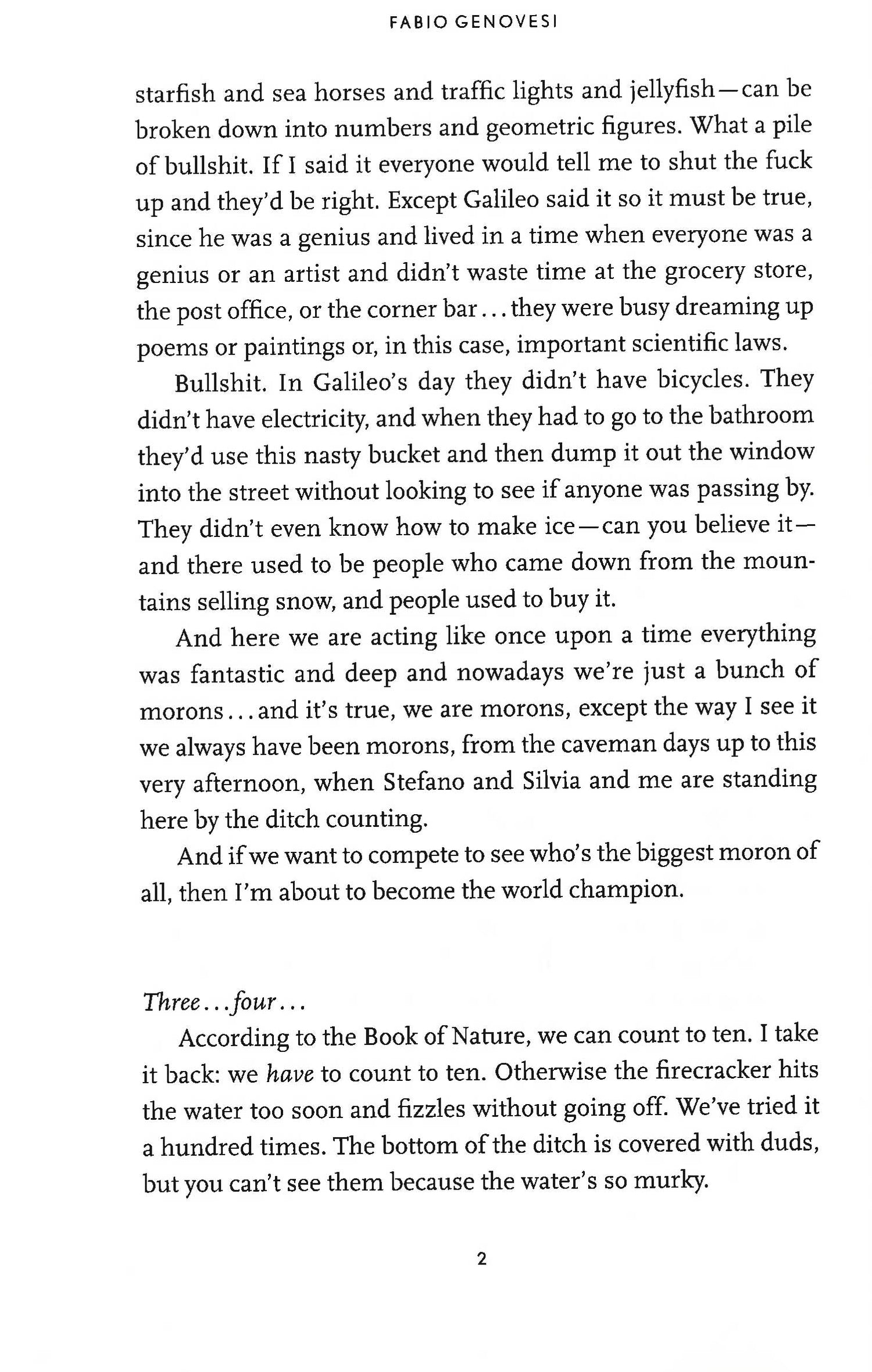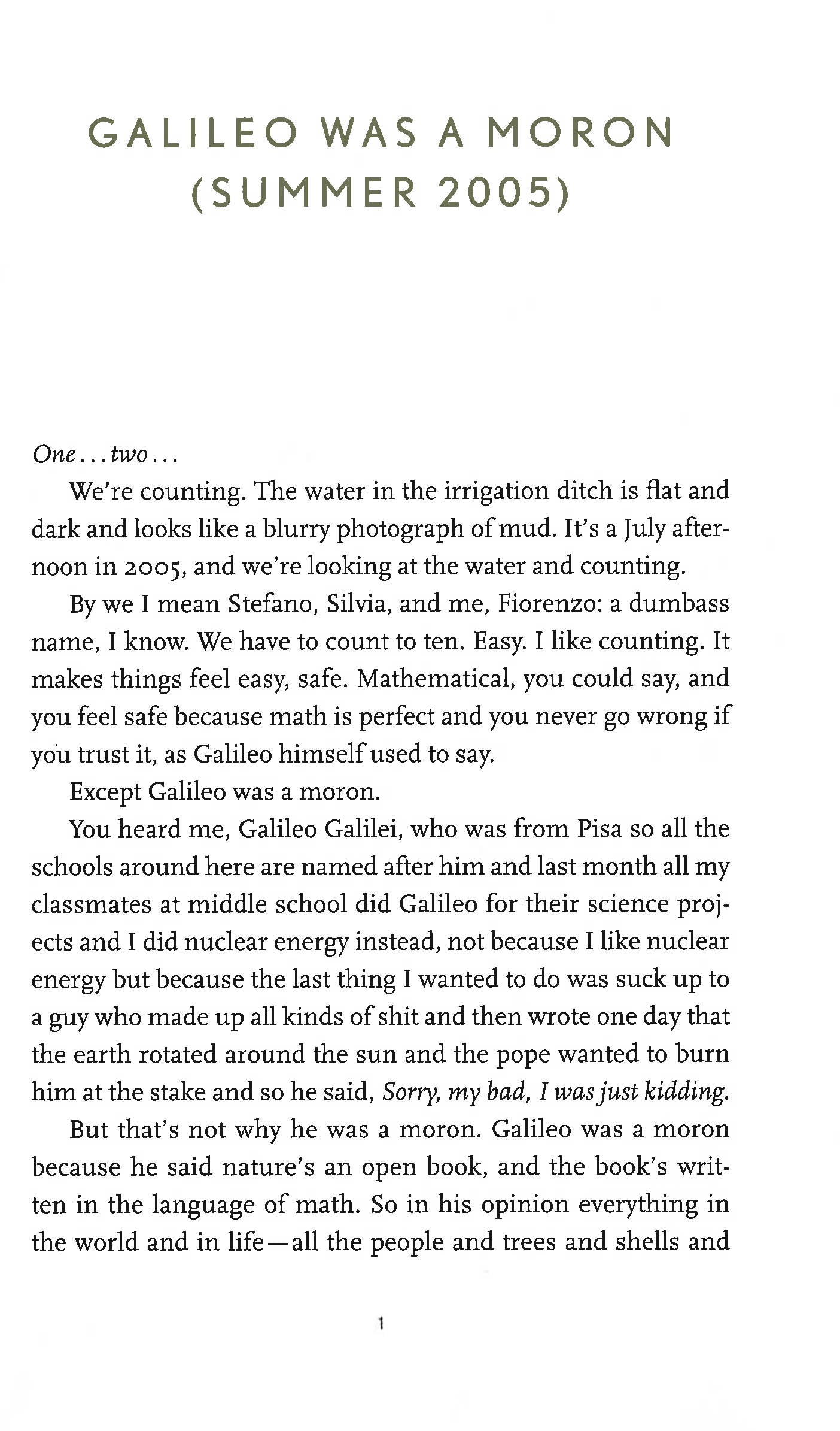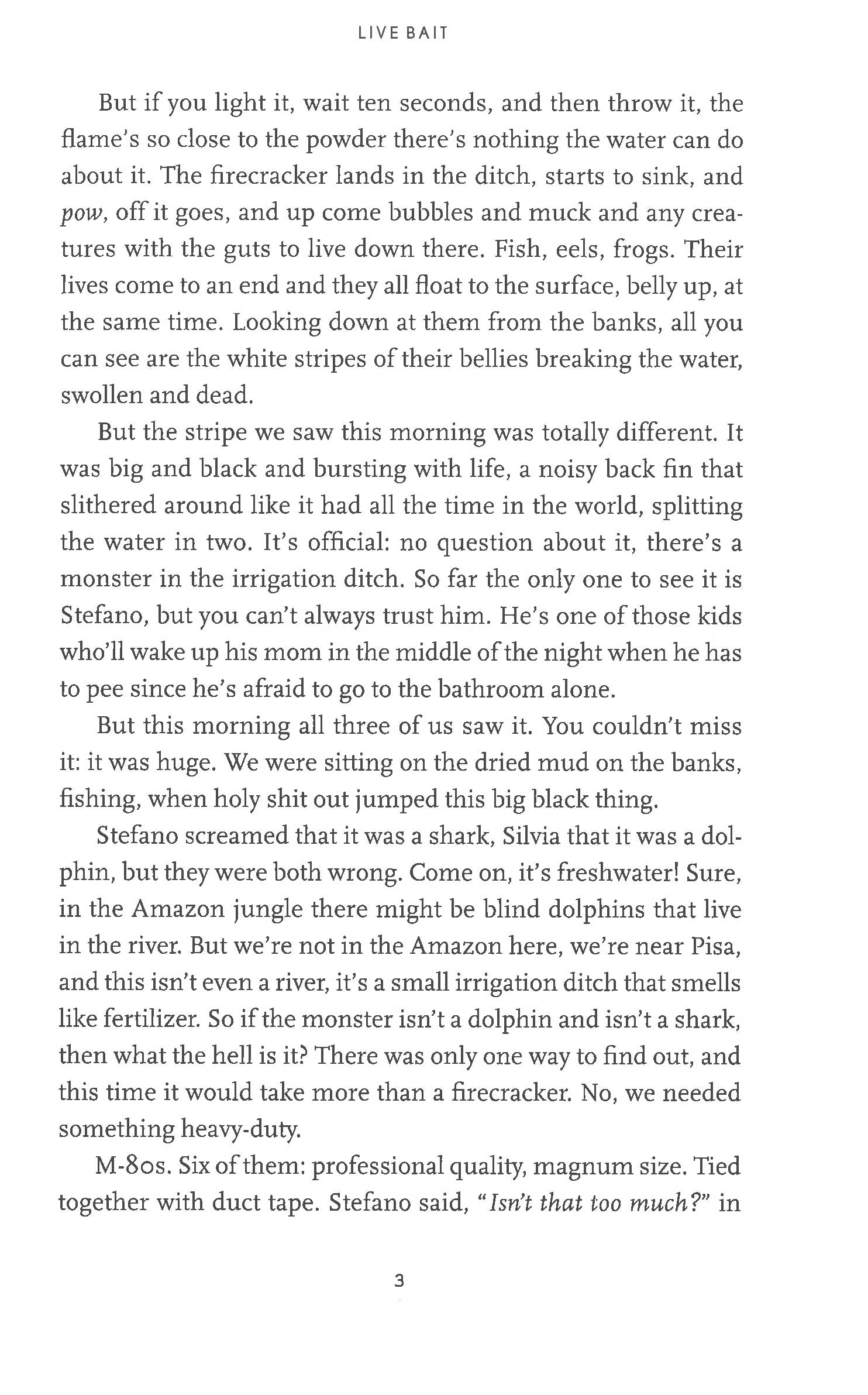 Muglione. Nothing grows in this Tuscan backwater except the wild imagination of Fiorenzo, a nineteen-year-old metalhead. He lives for his garage band, horror movies, and fishing in the murky irrigation ditches outside of town. But when his path crosses with Mirko, the teenage cycling phenomenon, and Tiziana, the smart but frustrated head of the local youth center turned refuge for the town's hard-drinking seniors, his world will never be the same. From the brink of despair they fight their way back through honesty, resilience, and laughter, their fates interweaving in a story that is at once achingly funny, bitter, and full of poetic fervor.
