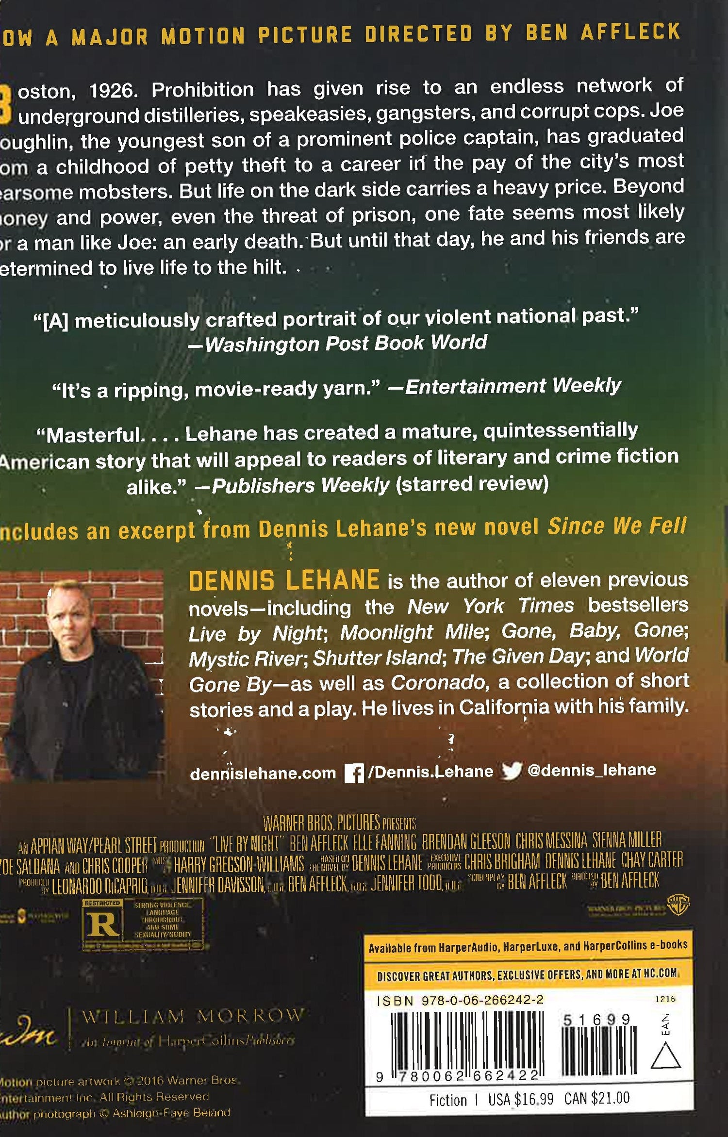 Boston, 1926. The '20s are roaring. Liquor is flowing, bullets are flying, and one man sets out to make his mark on the world. Prohibition has given rise to an endless network of underground distilleries, speakeasies, gangsters, and corrupt cops. Joe Coughlin, the youngest son of a prominent Boston police captain, has long since turned his back on his strict and proper upbringing. Now having graduated from a childhood of petty theft to a career in the pay of the city's most fearsome mobsters, Joe enjoys the spoils, thrills, and notoriety of being an outlaw. But life on the dark side carries a heavy price. In a time when ruthless men of ambition, armed with cash, illegal booze, and guns, battle for control, no one - neither family nor friend, enemy nor lover - can be trusted. Beyond money and power, even the threat of prison, one fate seems most likely for men like Joe: an early death. But until that day, he and his friends are determined to live life to the hilt. Joe embarks on a dizzying journey up the ladder of organized crime that takes him from the flash of Jazz Age Boston to the sensual shimmer of Tampa's Latin Quarter to the sizzling streets of Cuba. Live by Night is a riveting epic layered with a diverse cast of loyal friends and callous enemies, tough rumrunners and sultry femmes fatales, Bible-quoting evangelists and cruel Klansmen, all battling for survival and their piece of the American dream. At once a sweeping love story and a compelling saga of revenge, it is a spellbinding tour de force of betrayal and redemption, music and murder, that brings fully to life a bygone era when sin was cause for celebration and vice was a national virtue.