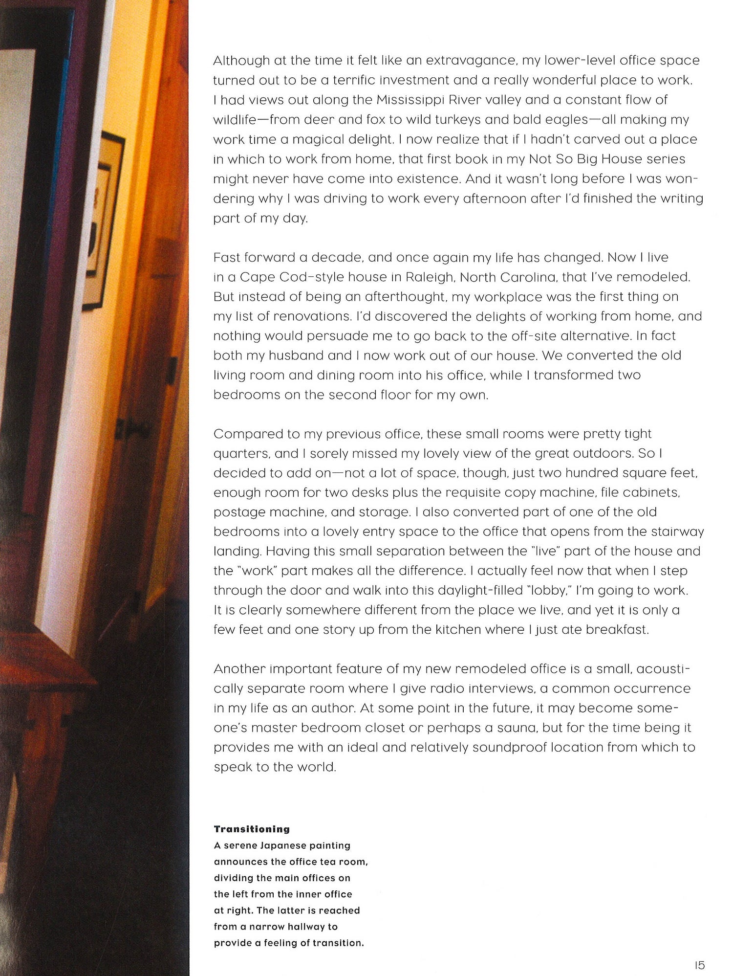 In the same format as the popular "Living Large in Small Spaces", "Live/Work" by Deborah K. Dietsch is full of innovative and inspired ideas for incorporating work into the home. The home office or business can be many things - writing desk, painter's studio, recording booth, architect's draft board, reading room, sanctuary - but the two dozen home offices profiled in "Live/Work" all have one thing in common: extraordinary design. Some of the spaces profiled are huge, taking up entire floors on their own, while others are cleverly tucked away in backyards or rebuilt garages. More than mere bill-paying desks or temporary work areas, these creative spaces have been carved out by some of the most progressive architects and designers in the world. The aesthetic tone of these offices ranges from classical to ultramodern, but the balance between life and work is completely natural.
