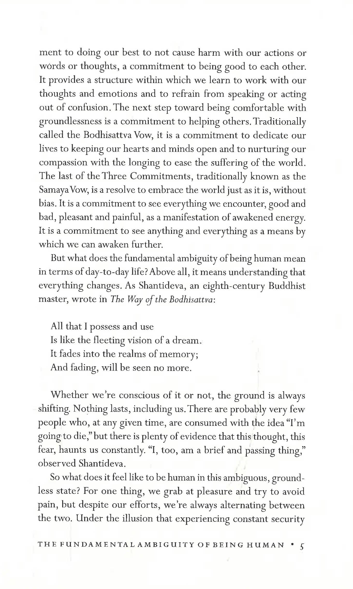 Instant bestseller: Buddhist teacher Pema Chödrön shares life-changing practices for living with wisdom, confidence, and integrity amidst confusing situations and uncertain times We live in difficult times. Life so often seems like a turbulent river threatening to drown us and destroy our world. Why, then, shouldn't we cling to the certainty of the comfortable--to our deep-seated habits and familiar ways? Because, Pema Chödrön teaches, that kind of fear-based clinging keeps us from the infinitely more powerful experience of being fully alive. The Buddhist teachings she presents here--known as the "Three Commitments"--provide a treasure trove of wisdom for learning to step right into the unknown, to completely and fearlessly embrace the groundlessness of being human, for people of all faiths. When we do, we begin to see not only how much better it feels to live an openhearted life, but we find that we begin to naturally and more effectively reach out to help and heal all those around us.