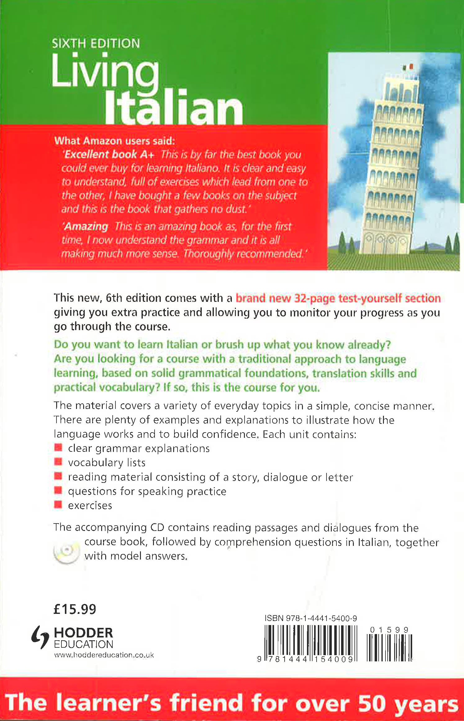 This new 6th edition includes an up-to-date culture and vocabulary guide, allowing you to broaden your knowledge of contemporary language and customs.Do you want to learn Italian or brush up what you know already? Are you looking for a course with a traditional approach to language learning, based on solid grammatical foundations, translation skills and practical vocabulary? If so, this is the course for you.The material covers a variety of everyday topics in a simple, concise manner. There are plenty of examples and explanations to illustrate how the language works and to build confidence. Each unit, designed to build systematically on what you have already learned, contains:- clear grammar explanations- vocabulary lists- reading material consisting of a story, dialogue or letter- questions for speaking practice- exercises- 32pp test-yourself section giving you extra practice and allowing you to monitor your progress as you go through the course, helping you keep on top of tricky grammar points and regularly testing the vocabulary you're learning.There are also revision units to help you practise what you are learning. At the back of the book, an exercise key enables you to check your answers while grammar and vocabulary sections provide a useful reference.The accompanying audio will help you with listening and speaking. In addition to a full pronunciation section, it contains reading passages and dialogues from the course book, followed by comprehension questions in Italian, together with model answers.Download our free app, Teach Yourself Library, from the App Store or Google Play to access the free audio.