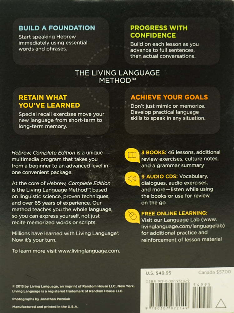 Hebrew, Complete Edition is a unique multimedia course that takes you from a beginner to an advanced level in one convenient package. At the core of Hebrew, Complete Edition is the Living Language Method(TM), based on linguistic science, proven techniques, and over 65 years of experience. Our method teaches you the whole language, so you can express yourself, not just recite memorized words or scripts. Millions have learned with Living Language(R). Now it's your turn.