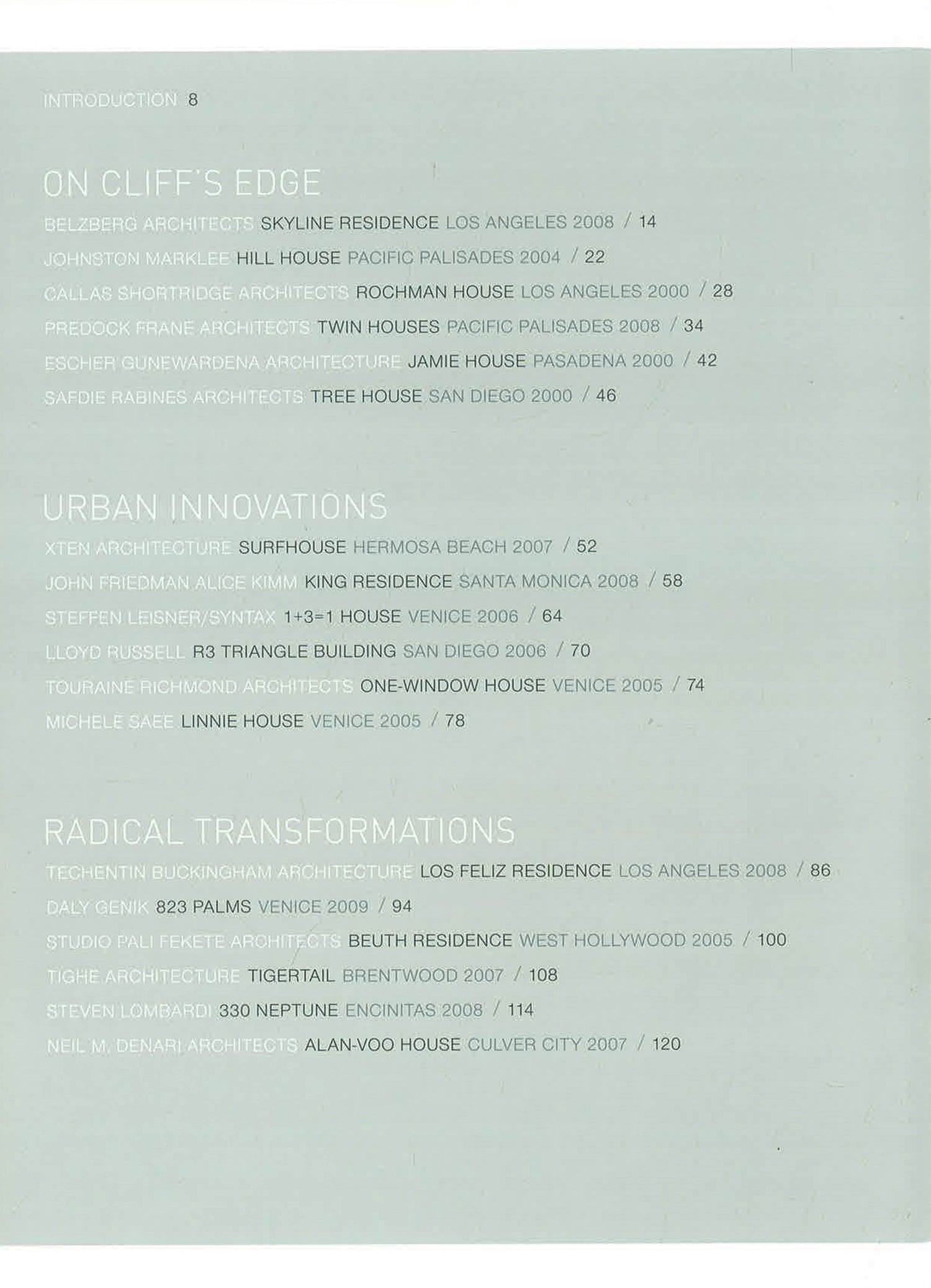 A dense concentration of design talent, uniquely varied topography, and one of the worlds most pleasant climates have made southern California a crucible of architectural innovation. There, forward-looking clients respond to dramatic modern interpretations of form and site that capitalize on natural light and magnificent ocean views, perch delicately on steeply graded land, or maximize privacy on a sliver of a city lot. In this title, thirty of the best designs by the most creative firms portray the diversity of southern California's architecture. Sam Lubell draws examples from Montecito to San Diego and the arid conditions of Joshua Tree to illustrate the wide range of responses to geography, budget and space.