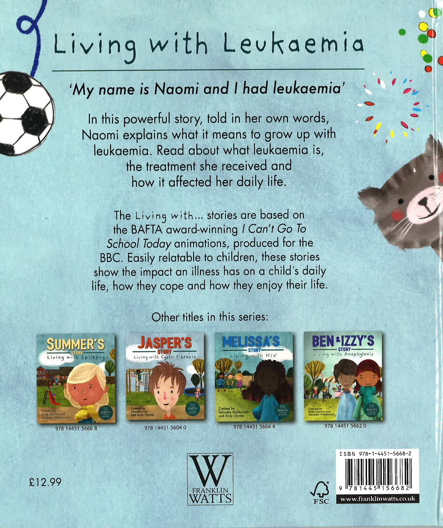 This powerful and eye opening picture book uses the first-person testimony of Naomi, a 10-year-old girl with acute lymphoblastic leukaemia. Naomi bravely explains what it was like to find out she had cancer, when she lost all her hair and what it was like spending so much time in hospital.