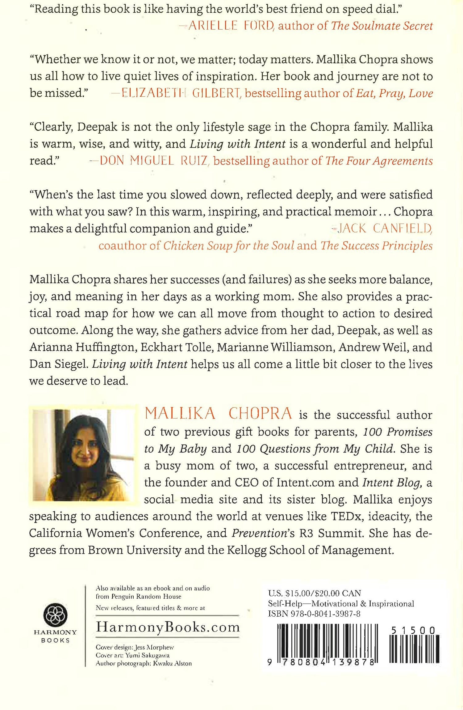 "I'm trying to meditate one day but urgent thoughts keep intruding. Don't forget to take cupcakes to school! I have to prepare for my presentation for the wellness conference! Is that lunch with the other moms tomorrow or next week? My to-do list is stampeding through my mind, trampling any chance of tranquility. I feel overwhelmed, yes, but there's more: I feel...guilty. Guilty that I'm taking on too much, guilty that I'm not doing anything well, guilty that I'm giving short shrift to my kids, my husband, my job. And what about you, Mallika? a quiet voice asks. How are you shortchanging yourself?" Living with Intent is a chronicle of Mallika Chopra's search to find more meaning, joy, and balance in life. She hopes that by telling her story, she can inspire others with her own successes (and failures) as well as share some of the wisdom she has gathered from friends, experts, and family along the way--people like her dad, Deepak, as well as Eckhart Tolle, Marianne Williamson, Arianna Huffington, Andrew Weil, and Dan Siegel. She also provides a practical road map for how we can all move from thought to action to outcome. Each chapter is devoted to one step on her journey and another piece of her INTENT action plan: Incubate, Notice, Trust, Express, Nurture, and Take Action. Chopra's insights and advice will help us all come closer to fully living the lives we truly intend.