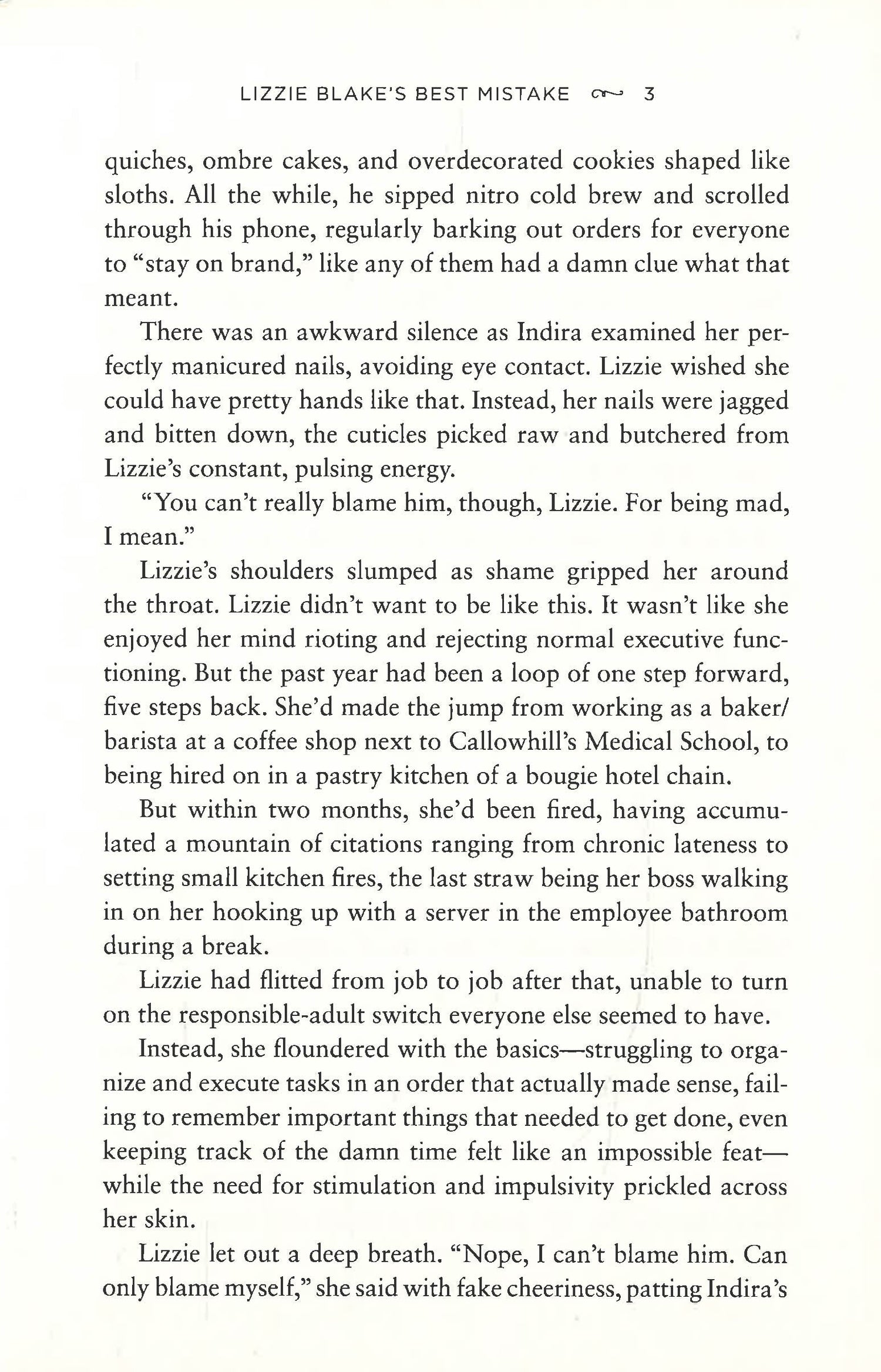 Lizzie has made endless mistakes. Kitchen fires, pyramid schemes, bangs (of the hair and human variety), you name it, she's done it... and made a mess of it too. One mistake she's never made is letting anyone get closer to her than a single hook-up. But after losing yet another bakery job due to her uncontrolled ADHD, she breaks her cardinal rule and has a two-night-stand that changes everything.