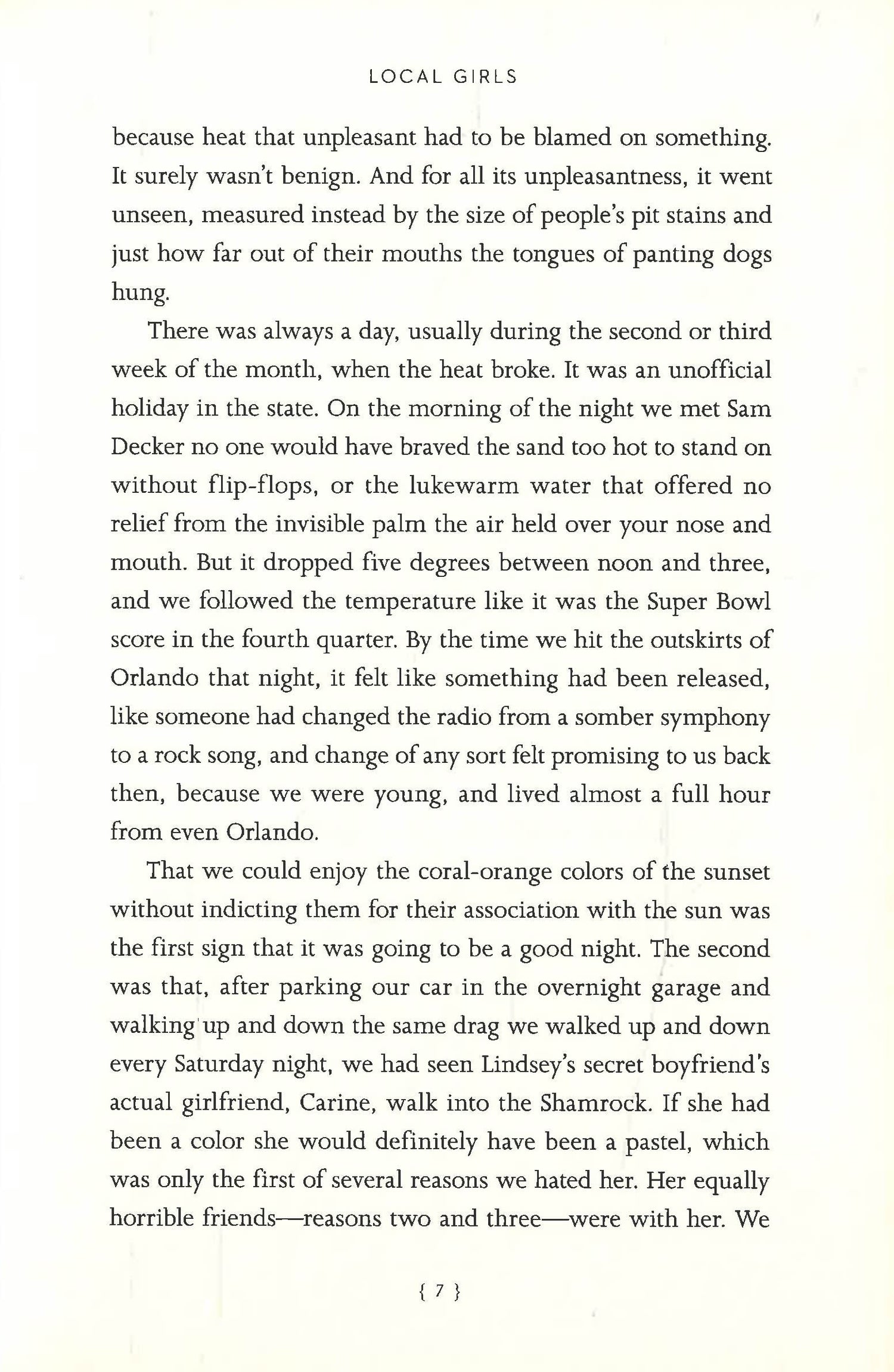 Passing through Orlando, Sam Decker comes to The Shamrock seeking anonymity, but finds Maggie, Lindsey, and Nina instead. Obsessed with celebrity magazines that allow them a taste of the better lives they might have had, the girls revel in his company. But the appearance of Lila, the estranged former member of the girls group, turns the focus to their shared history, bringing all their old antagonisms to the surface Lila s defection to Orlando s country club school when her father came into some money, and the strange, enchanting boy she brought into their circle, who fundamentally altered dynamics that had been in play for years. By the night s end, the escalation of these long-buried issues forces them to see one another as the women they are now instead of the girls they used to be.